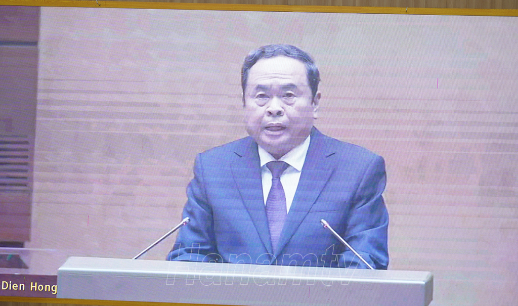 Chủ tịch Quốc hội Trần Thanh Mẫn Trình bày báo cáo chuyên đề "Chủ trương, giải pháp về thể chế, thúc đẩy phát triển khoa học, công nghệ, đổi mới sáng tạo và chuyển đổi số quốc gia". (ảnh chụp màn hình trực tuyến)