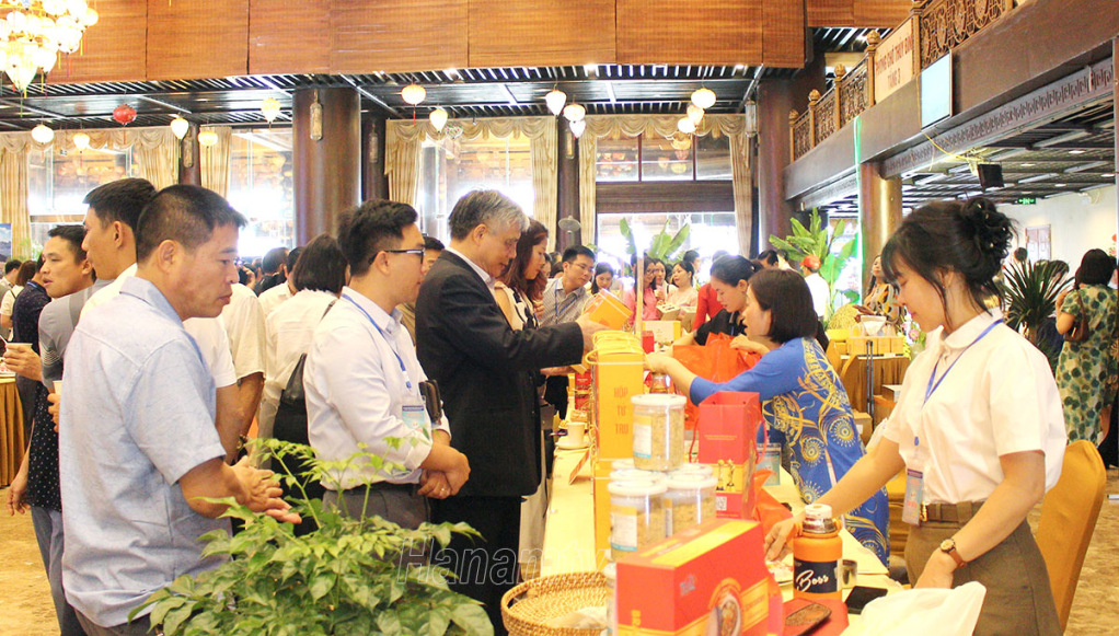 Các đại biểu tham quan trưng bày giới thiệu sản phẩm OCOP tiêu biểu tỉnh Hà Nam.