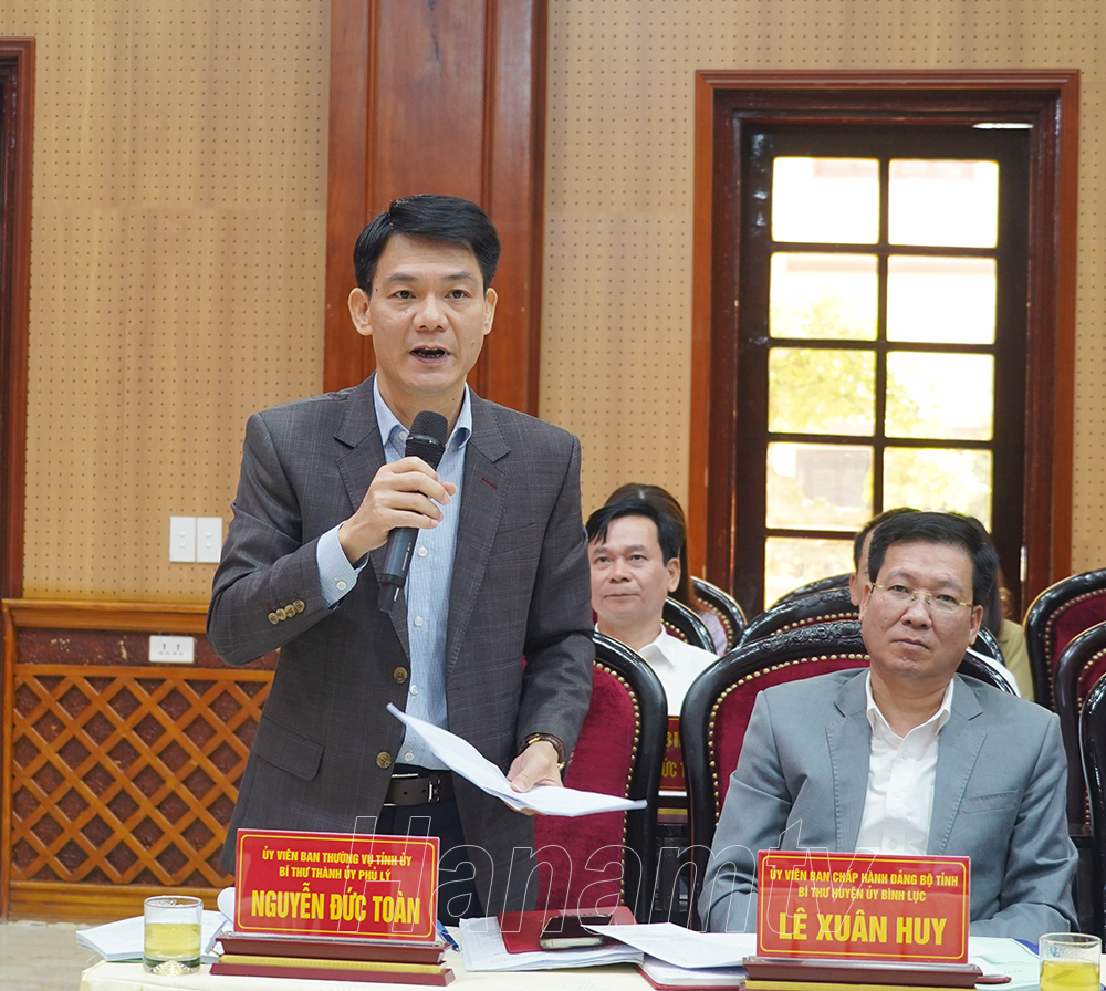 Đồng chí Nguyễn Đức Toàn, Ủy viên BTV Tỉnh ủy, Bí thư Thành ủy Phủ Lý phát biểu tham luận tại Hội thảo.