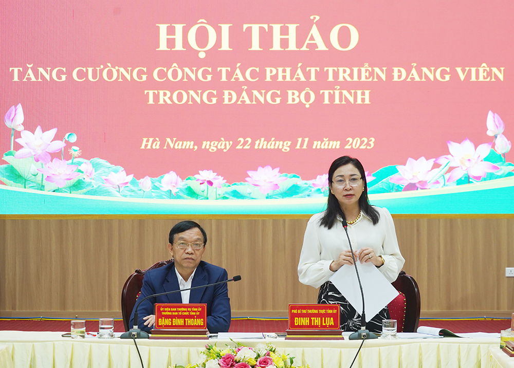 Sáng 22/11, Tỉnh ủy Hà Nam tổ chức Hội thảo với chủ đề “Tăng cường công tác phát triển Đảng viên trong Đảng bộ tỉnh". Đồng chí Đinh Thị Lụa, Phó Bí thư Thường trực Tỉnh ủy chủ trì hội thảo. Đồng chí Đặng Đình Thoảng, Ủy viên Ban Thường vụ (BTV) Tỉnh ủy, Trưởng Ban Tổ chức Tỉnh ủy đồng chủ trì.