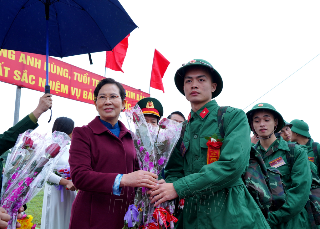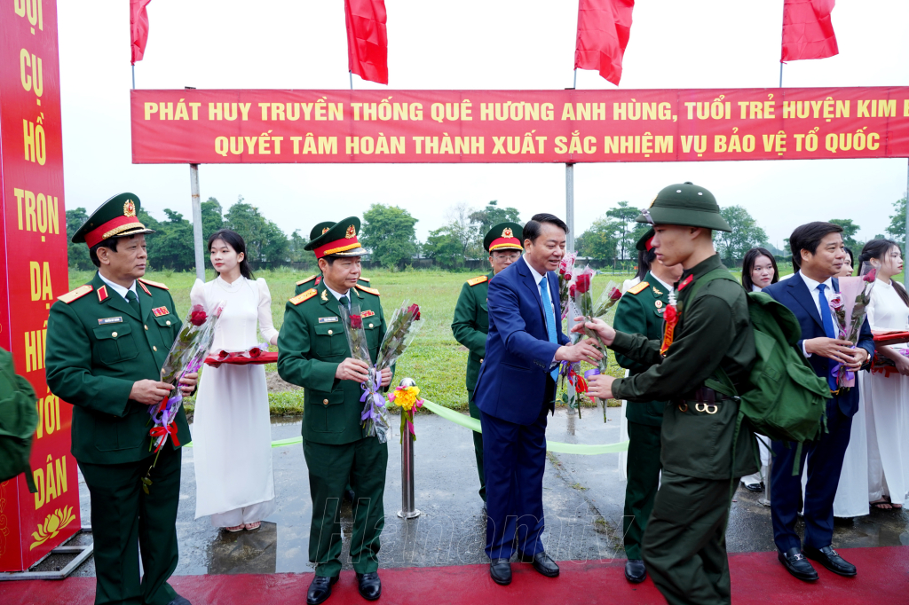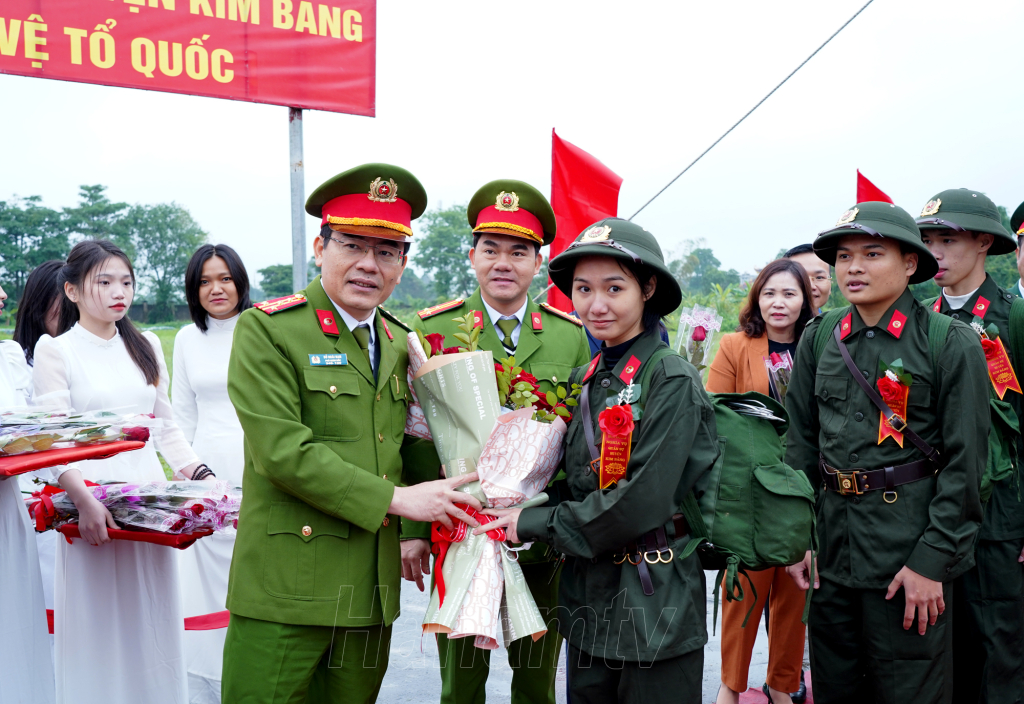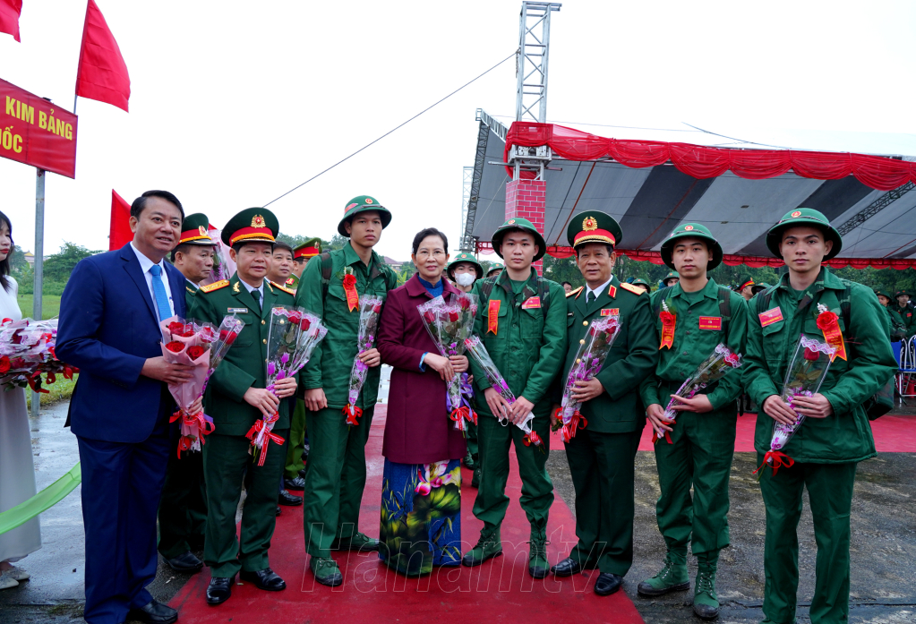 Đồng chí Lê Thị Thủy, Ủy viên TW Đảng, Bí thư Tỉnh ủy, Chủ tịch HĐND tỉnh cùng các đồng chí đại diện lãnh đạo Quân khu 3, lãnh đạo Bộ Chỉ huy Quân sự tỉnh và huyện Kim Bảng tặng hoa, thăm hỏi, động viên tân binh lên đường nhập ngũ.