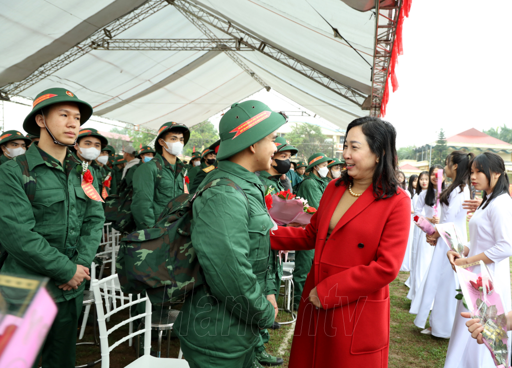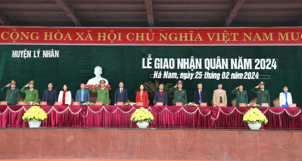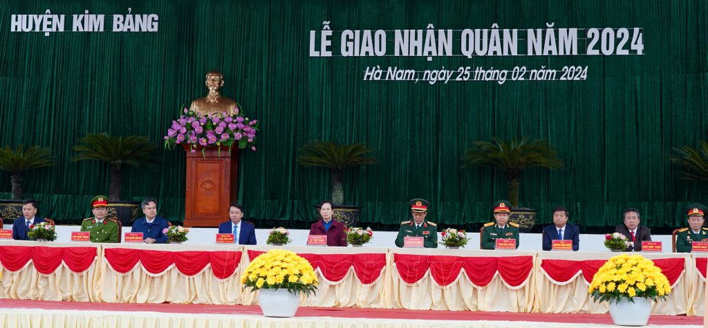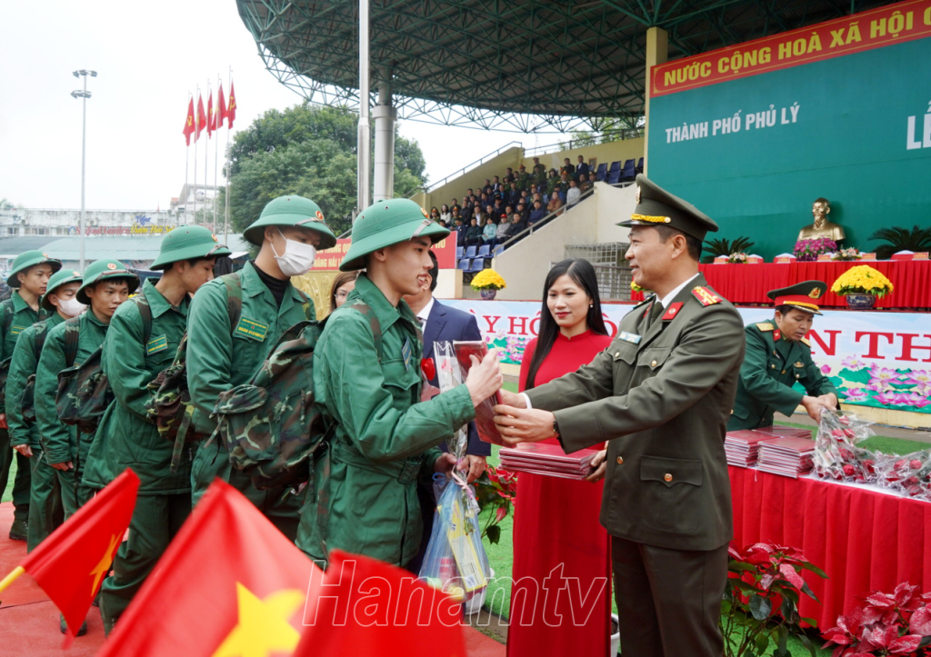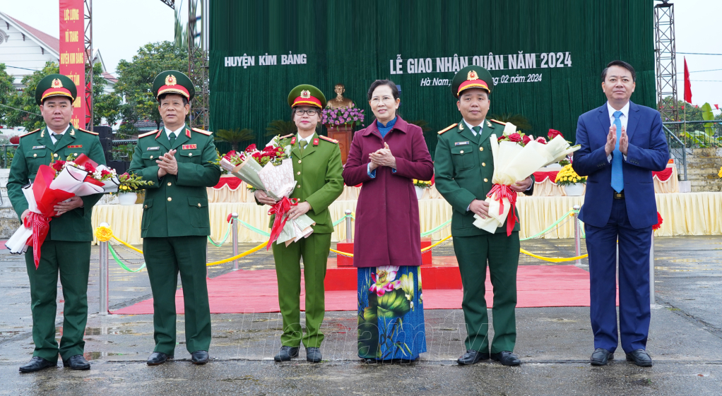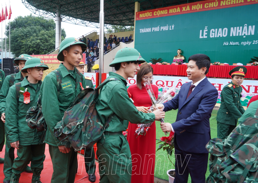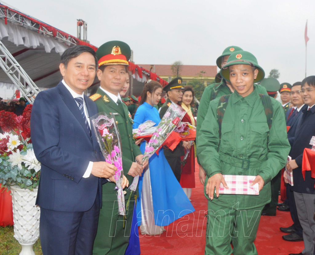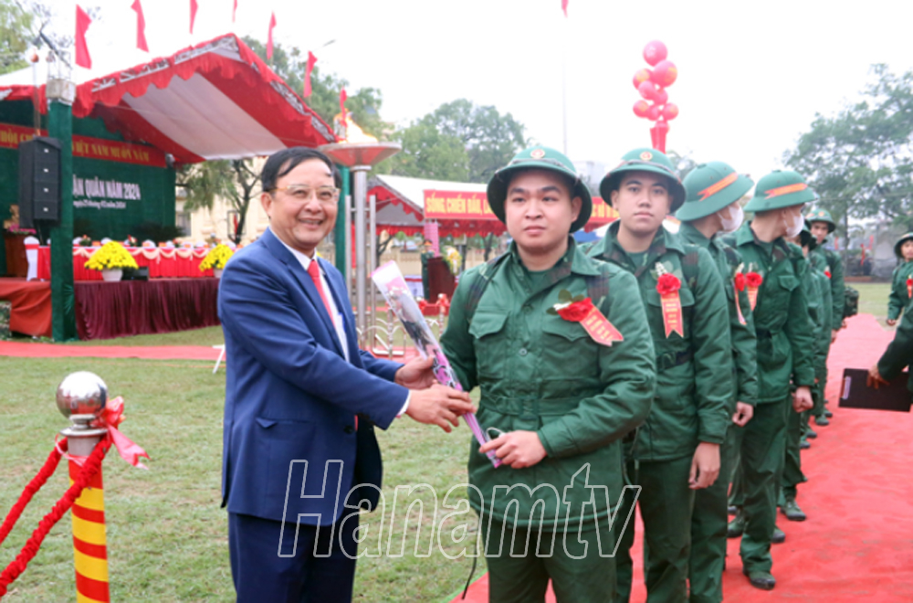Đồng chí Bí thư Tỉnh ủy Lê Thị Thủy tặng hoa, động viên các tân binh của huyện Kim Bảng lên đường nhập ngũ.Đồng chí Phó Bí thư Thường trực Tỉnh ủy Đinh Thị Lụa trò chuyện, động viên các tân binh huyện Lý Nhân trước giờ lên đường nhập ngũ. Đồng chí Trương Quốc Huy, Phó Bí thư Tỉnh ủy, Chủ tịch UBND tỉnh, Trưởng đoàn ĐBQH tỉnh tặng hoa, động viên tân binh TP Phủ Lý.