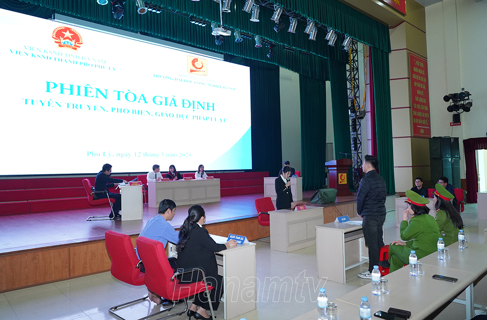 Chiều 12/3, tại Trường Đại học Công nghiệp Hà Nội, cơ sở Hà Nam, Viện Kiểm sát nhân dân (KSND) TP Phủ Lý tổ chức phiên tòa giả định vụ án "trộm cắp tài sản” tuyên truyền, phổ biến giáo dục pháp luật cho gần 300 sinh viên của nhà trường. Đây là phiên tòa giả định thứ 6 Viện KSND TP Phủ Lý tổ chức trong trường học trên địa bàn thành phố để tuyên truyền pháp luật và đã nhận được hiệu ứng tích cực từ các thầy cô giáo và các em học sinh, sinh viên.