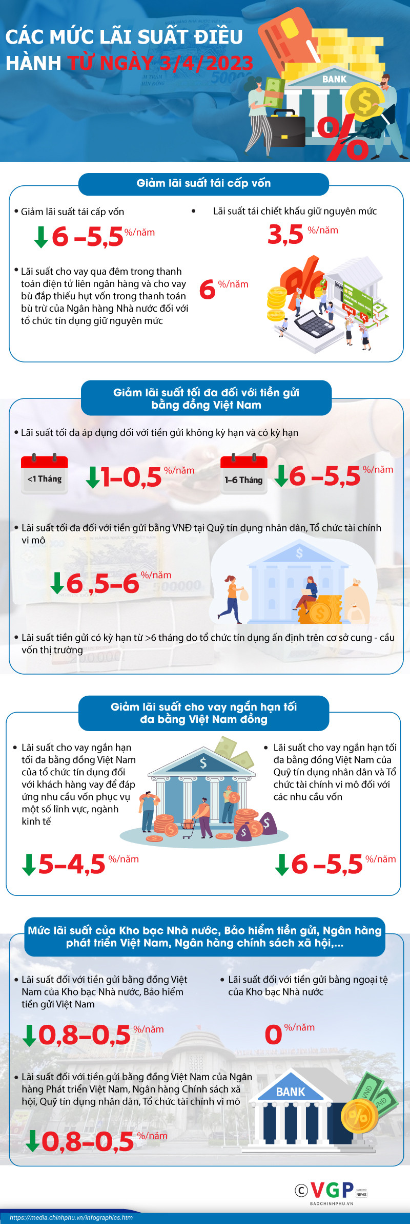 Infographics: Các mức lãi suất điều hành có hiệu lực từ ngày 3/4/2023