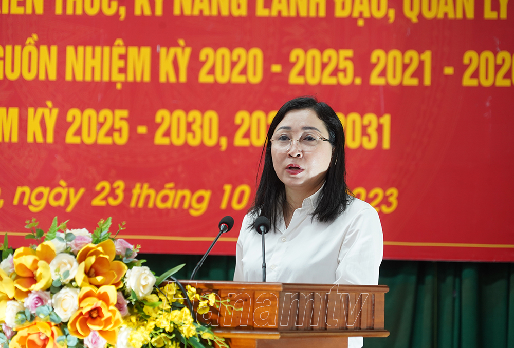 Phát biểu khai giảng lớp học, đồng chí Đinh Thị Lụa, Phó Bí thư Thường trực Tỉnh ủy nhấn mạnh: Quán triệt thực hiện Nghị quyết Đại hội XIII của Đảng, Nghị quyết Đại hội Đảng bộ tỉnh Hà Nam lần thứ XX, nhiệm kỳ 2020-2025, nhất là Nghị quyết Trung ương 7 (khóa XII) về tập trung xây dựng đội ngũ cán bộ các cấp, nhất là cấp chiến lược, đủ phẩm chất, năng lực và uy tín, ngang tầm nhiệm vụ, BTV Tỉnh ủy Hà Nam luôn xác định nâng cao chất lượng đội ngũ cán bộ các cấp, trọng tâm là cán bộ lãnh đạo chủ chốt và người đứng đầu, đủ năng lực, phẩm chất, đáp ứng được yêu cầu nhiệm vụ; quan tâm cán bộ nữ, cán bộ trẻ, đảm bảo tính kế thừa, phát triển và sự chuyển tiếp liên tục, vững vàng giữa các thế hệ cán bộ; tạo môi trường để cán bộ rèn luyện, sáng tạo, dám nghĩ, dám làm, dám chịu trách nhiệm vì sự phát triển chung là một nhiệm vụ then chốt, trọng tâm trong công tác xây dựng Đảng.