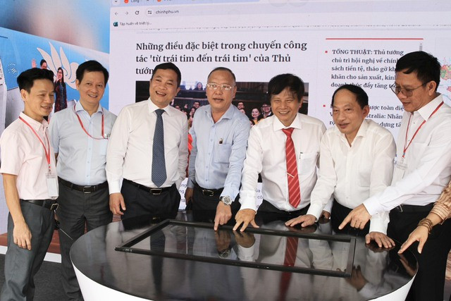 Các đồng chí lãnh đạo Đảng, Nhà nước, lãnh đạo TPHCM trải nghiệm tương tác trực tiếp trên giao diện Báo Điện tử Chính phủ ngay tại gian trưng bày - Ảnh: VGP/Lê Anh