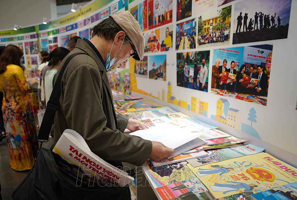 Độc giả tham quan, thưởng thức các ấn phẩm báo chí tại khu trưng bàyKhu trưng bày các ấn phẩm báo chí của cơ quan báo chí các địa phương.