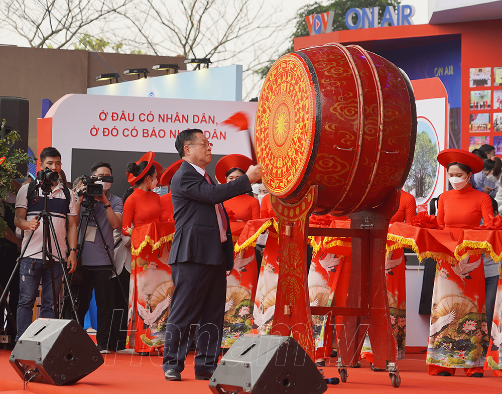 Các lãnh đạo Đảng, Nhà nước cắt băng khai mạc Hội báo toàn quốc năm 2022.Bí thư Trung ương Đảng, Trưởng Ban Tuyên giáo Trung ương Nguyễn Trọng Nghĩa đánh trống khai mạc Hội báo toàn quốc năm 2022.