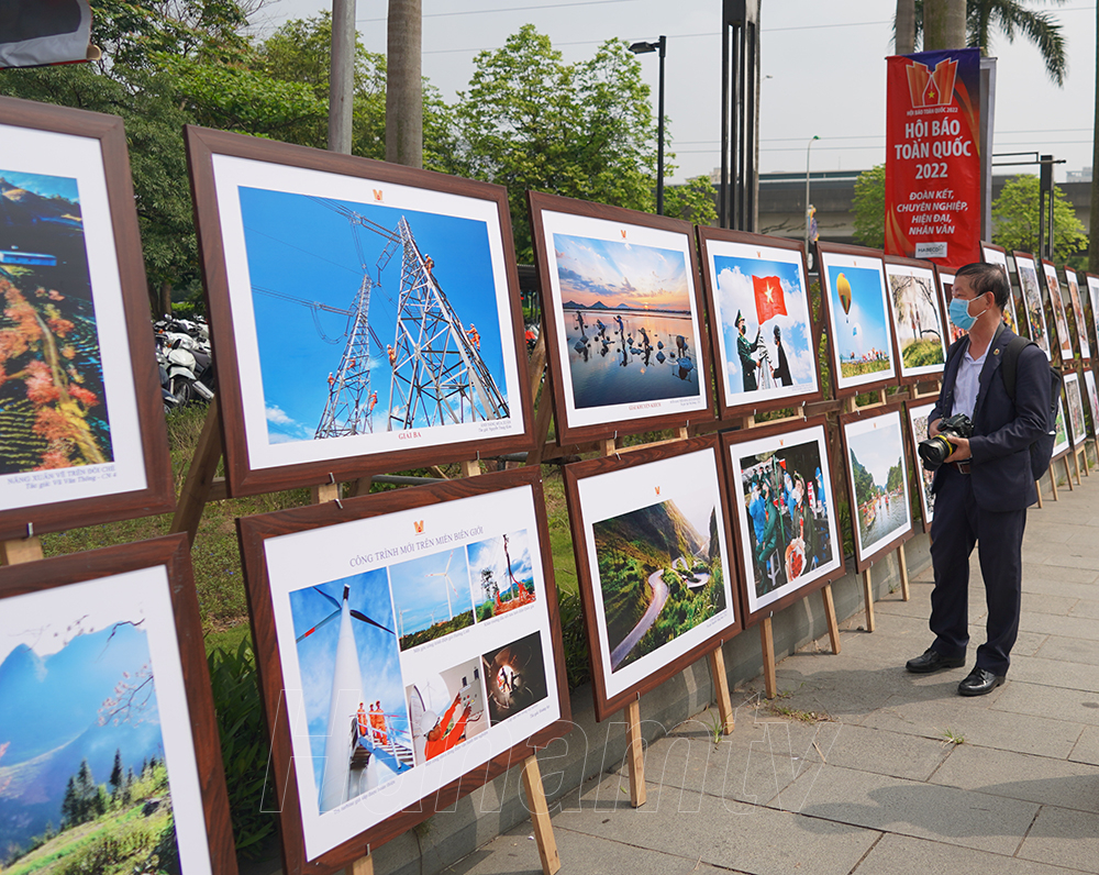 Không gian trưng bày các tác phẩm ảnh báo chíCác tác phẩm ảnh báo chí ấn tượng, phản ánh các sự kiện chính trị, kinh tế, văn hóa và truyền tải hơi thở của cuộc sống được trưng bày tại Hội báo.