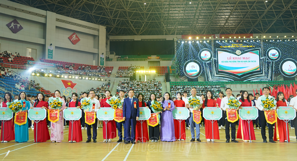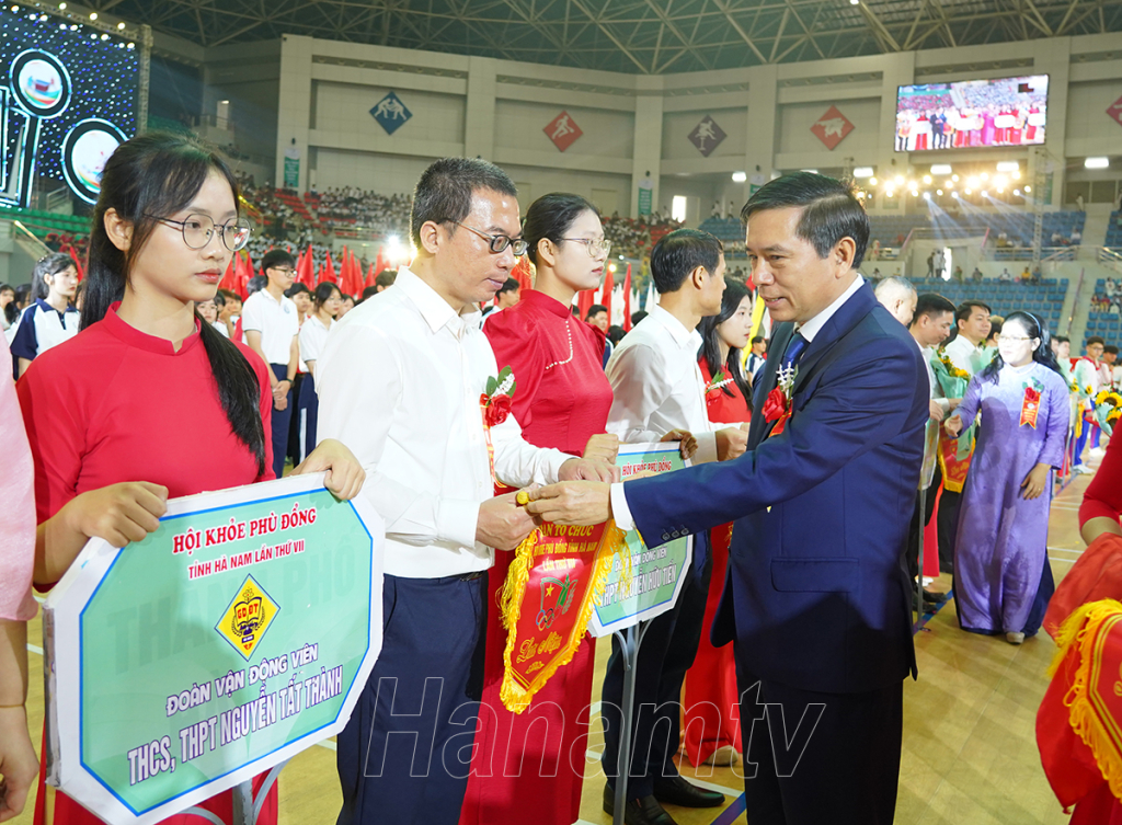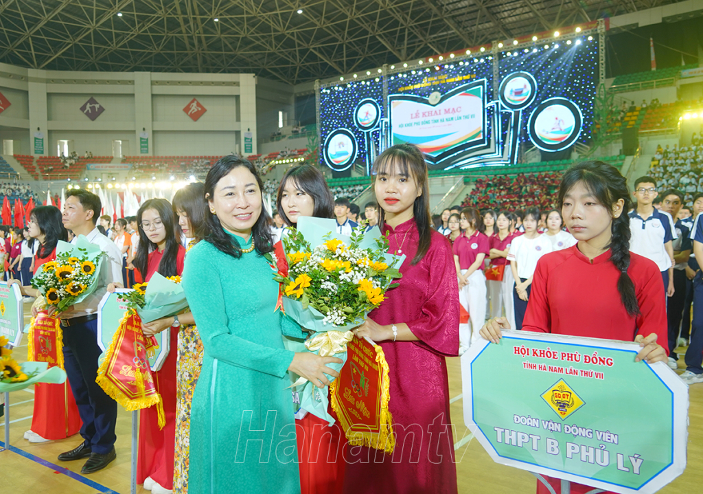 Đồng chí Lê Thị Thủy, Ủy viên Trung ương Đảng, Bí thư Tỉnh ủy, Chủ tịch HĐND tỉnh tặng hoa, cờ lưu niệm cho các đơn vị tham dự Hội khỏe.Đồng chí Phó Bí thư Thường trực Tỉnh ủy Đinh Thị Lụa tặng hoa, cờ lưu niệm cho các đơn vị tham dự Hội khỏe. Đồng chí Phó Chủ tịch UBND tỉnh Trần Xuân Dưỡng tặng hoa, cờ lưu niệm cho các đơn vị tham dự Hội khỏe.Các đồng chí lãnh đạo Bộ GD&ĐT, lãnh đạo tỉnh Hà Nam tặng hoa, cờ lưu niệm cho các đơn vị tham dự Hội khỏe.