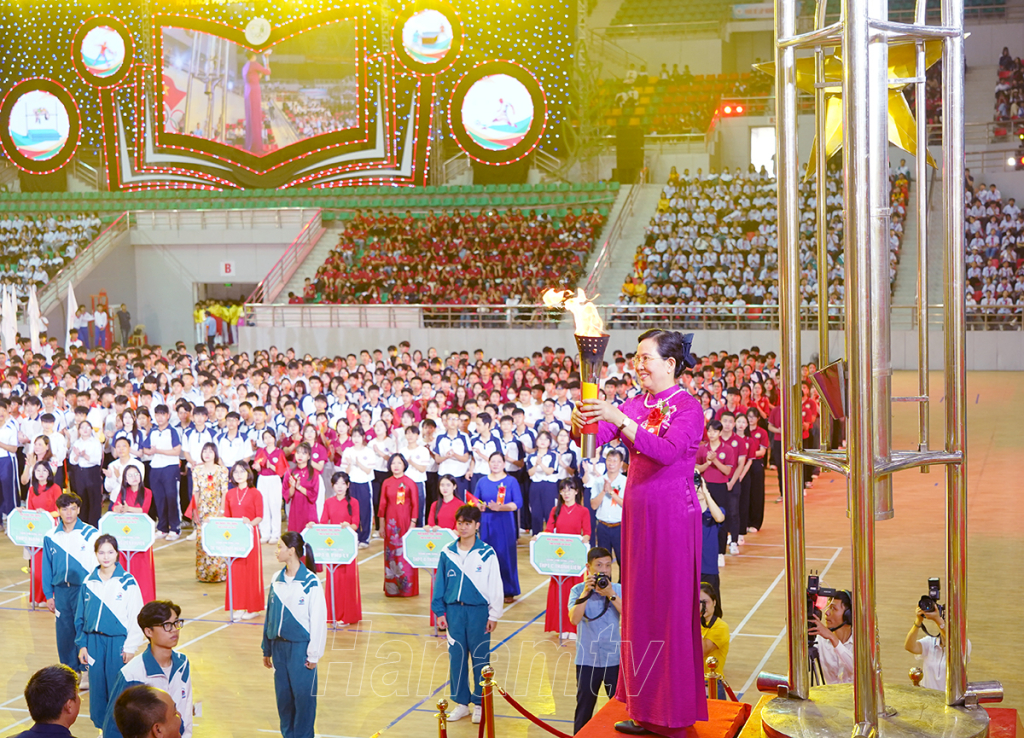 Đồng chí Lê Thị Thủy, Ủy viên TW Đảng, Bí thư Tỉnh ủy, Chủ tịch HĐND tỉnh thắp sáng Đài lửa truyền thống của Hội khỏe Phù Đổng.
