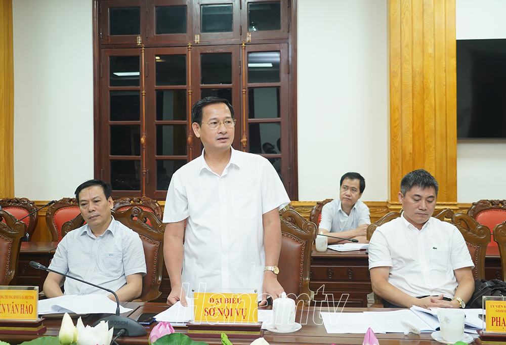 Lãnh đạo Sở Nội vụ phát biểu tại hội nghị.Thành viên Đoàn công tác trao đổi một số vấn đề về việc thực hiện Kết luận số 49-KL/TW.