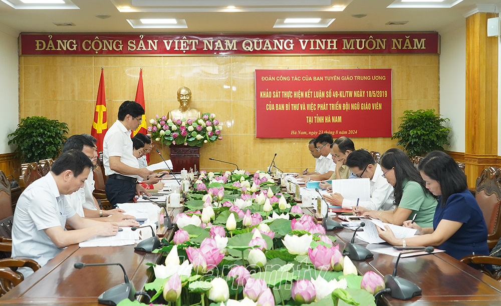 Chiều ngày 23/8, Đoàn công tác của Ban Tuyên giáo Trung ương do đồng chí Lê Mạnh Hùng, Phó Chủ tịch kiêm Tổng thư ký Hội khuyến học Việt Nam làm trưởng đoàn đã làm việc với tỉnh Hà Nam về khảo sát thực hiện Kết luận số 49-KL/TW ngày 10/5/2019 của Ban Bí thư Trung ương Đảng (khóa XII) về tiếp tục thực hiện Chỉ thị số 11-CT/TW của Bộ Chính trị “Về tăng cường sự lãnh đạo của Đảng đối với công tác khuyến học, khuyến tài, xây dựng xã hội học tập”. Tiếp và làm việc với đoàn có các đồng chí: Đinh Thị Lụa, Phó Bí thư Thường trực Tỉnh ủy; Đặng Thanh Sơn, Ủy viên Ban Thường vụ Tỉnh ủy, Phó Chủ tịch Thường trực HĐND tỉnh, lãnh đạo Ban Tuyên giáo Tỉnh ủy, lãnh đạo các sở, ban, ngành liên quan.