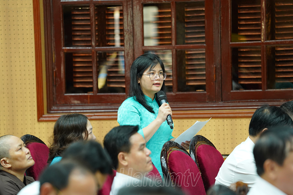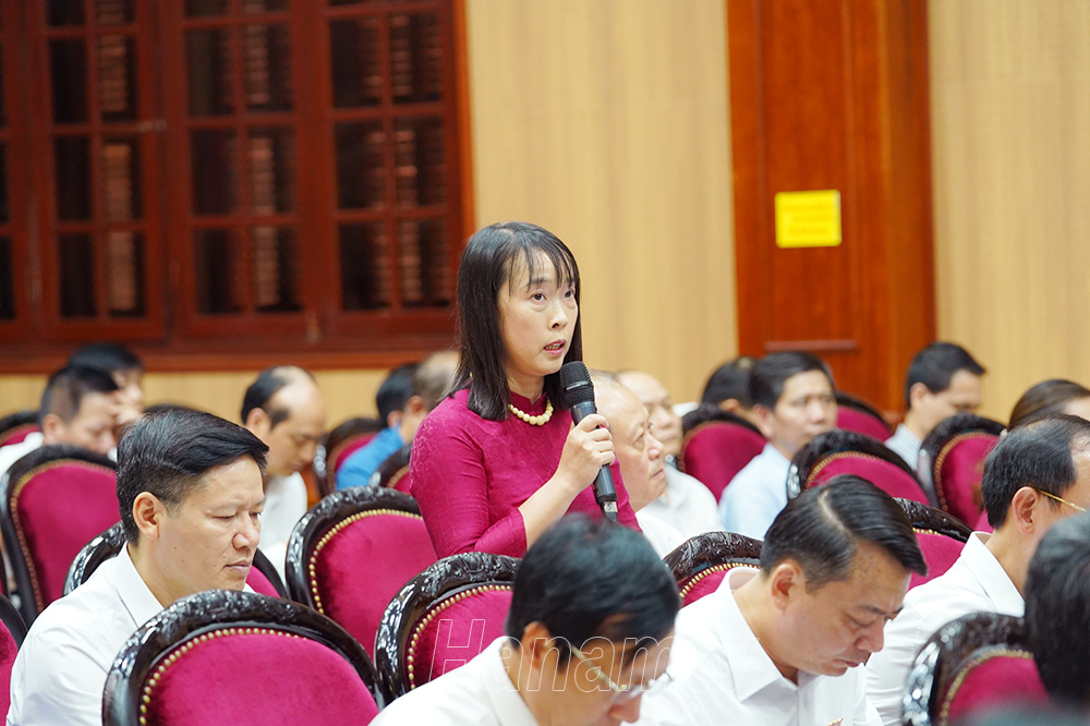 Đại biểu Đỗ Thị Dung, đại biểu HĐND tỉnh tổ Lý Nhân chất vấn Giám đốc Sở Nội vụ về vấn đề bổ sung chỉ tiêu biên chế giáo viên cho ngành giáo dục.