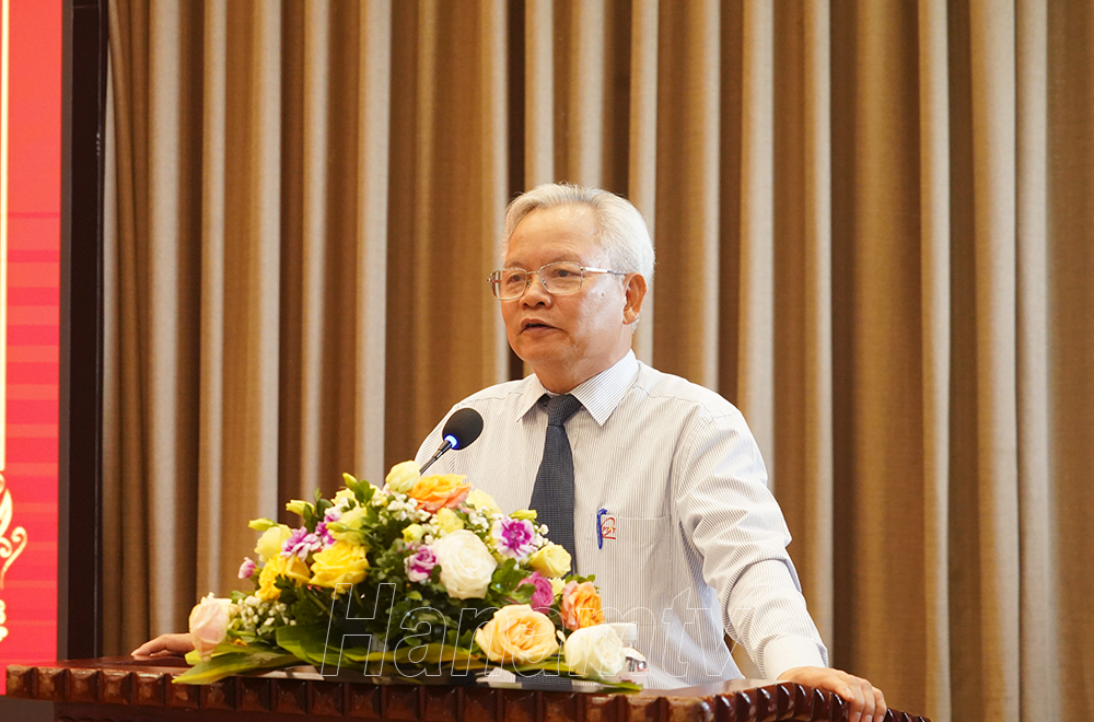 GS.TS Tạ Ngọc Tấn, nguyên Ủy viên Trung ương Đảng, Phó Chủ tịch Thường trực Hội đồng Lý luận Trung ương trình bày báo cáo tại Kỳ họp.