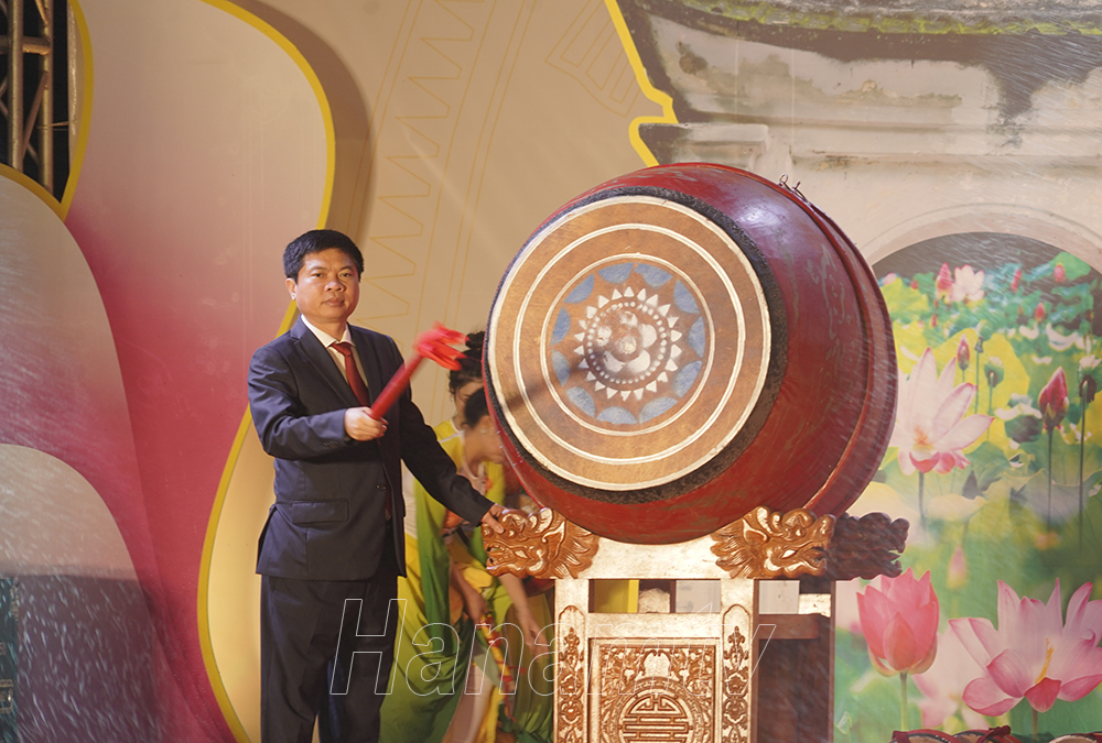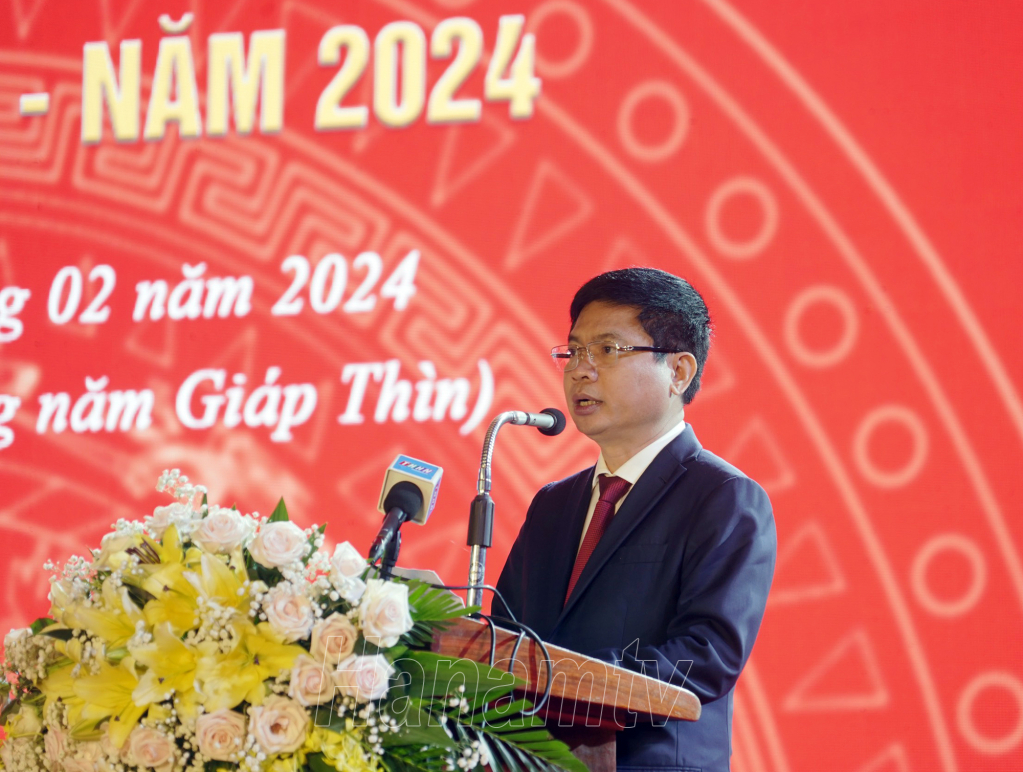 Đồng chí Trương Quốc Huy, Phó Bí thư Tỉnh ủy, Chủ tịch UBND tỉnh, Trưởng đoàn Đại biểu Quốc hội tỉnh đọc diễn văn và đánh trống khai mạc Lễ phát lương Đức Thánh Trần Đền Trần Thương xuân Giáp Thìn năm 2024.