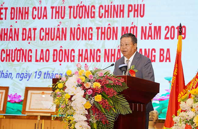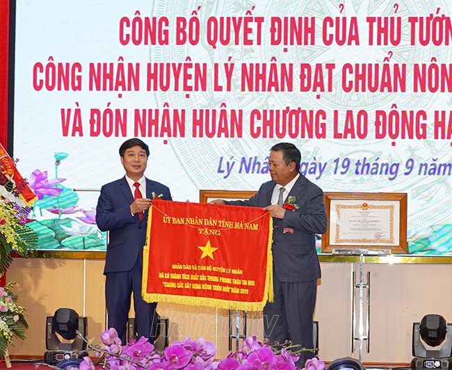 Chủ tịch UBND tỉnh tặng Cờ thi đua của UBND tỉnh cho nhân dân và cán bộ huyện Lý Nhân vì đã có thành tích xuất sắc trong phong trào Thi đua chung sức Xây dựng NTM năm 2019