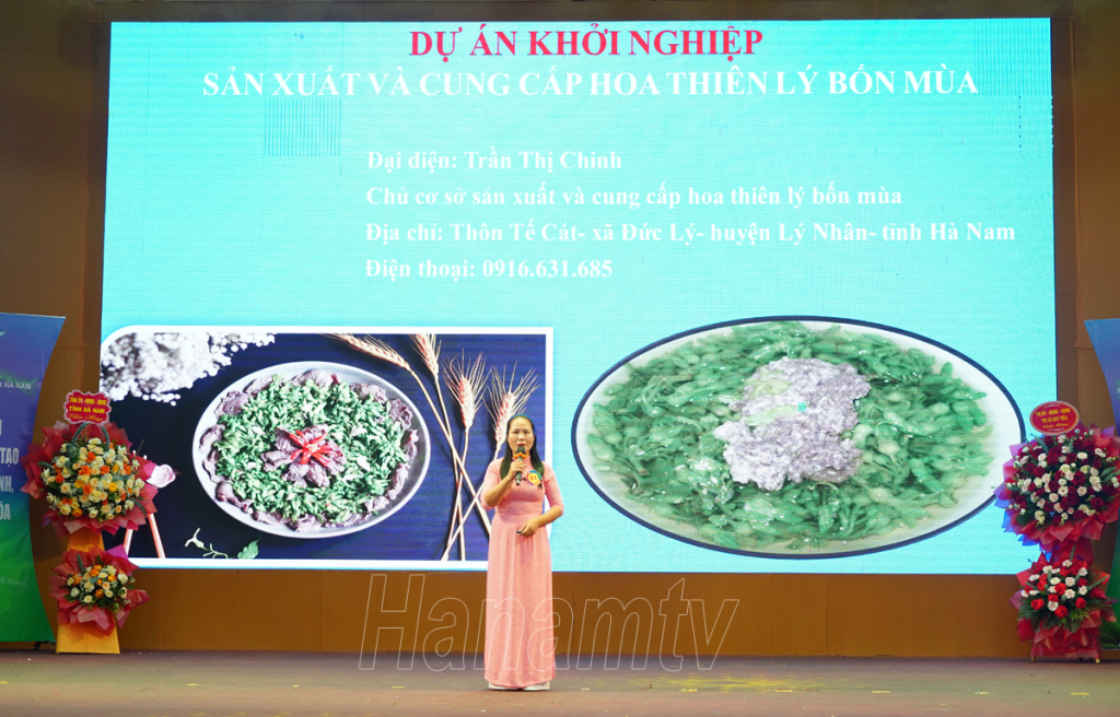 Trải qua 2 phần thi trình bày ý tưởng/dự án khởi sự kinh doanh, khởi nghiệp và phần thi triển lãm gian hàng, Ban tổ chức đã trao giải cho các ý tưởng dự án xuất sắc gồm: 1 giải Nhất, 2 giải Nhì, 3 giải Ba và 6 giải Khuyến khích. Trong đó, giải Nhất được trao chị Trần Thị Thu Thuỷ - xã Phù Vân, thành phố Phủ Lý với dự án “Sản xuất sản phẩm trà sen và các sản phẩm từ hoa sen, hoa súng.