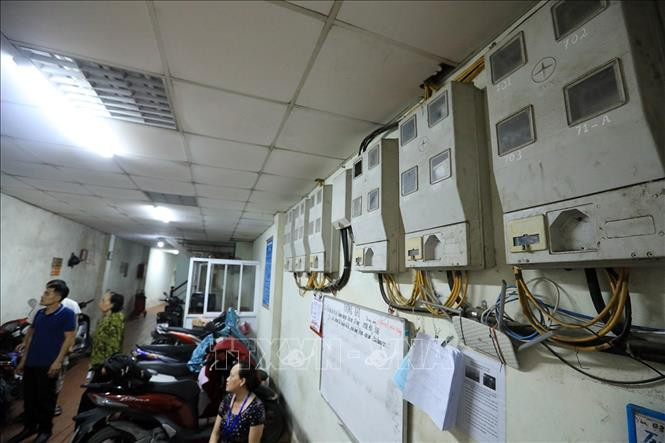 Các tủ điện để ngay dưới hầm để xe rất nguy hiểm, dễ xảy ra cháy nổ do chập điện. Ảnh: Tuấn Anh/TTXVN