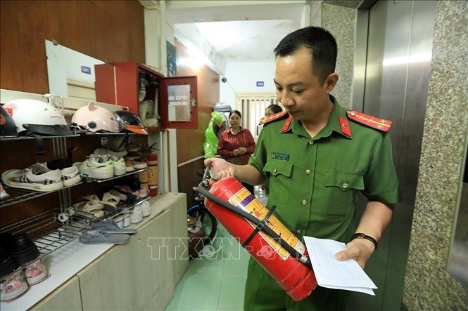 Cán bộ PCCC quận Bắc Từ Liêm kiểm tra bình cứu hỏa tại chung cư mini 205/53/50 Xuân Đỉnh. Ảnh: Tuấn Anh/TTXVN