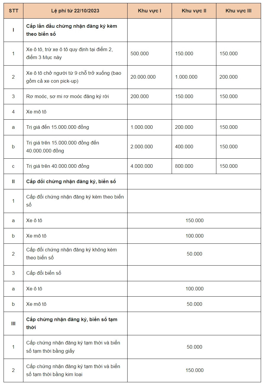 Thông 60/2023/TT-BTC có hiệu lực từ ngày 22/10/2023 quy định mức lệ phí đăng ký, cấp biển số mới đối các loại phương tiện giao thông cơ giới như sau: