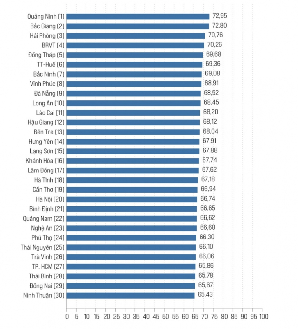 Trong khi đó, Bà Rịa - Vũng Tàu xếp ở vị trí thứ 4 với 70,26 điểm. Vị trí thứ 5 thuộc về Đồng Tháp với 69,68 điểm.