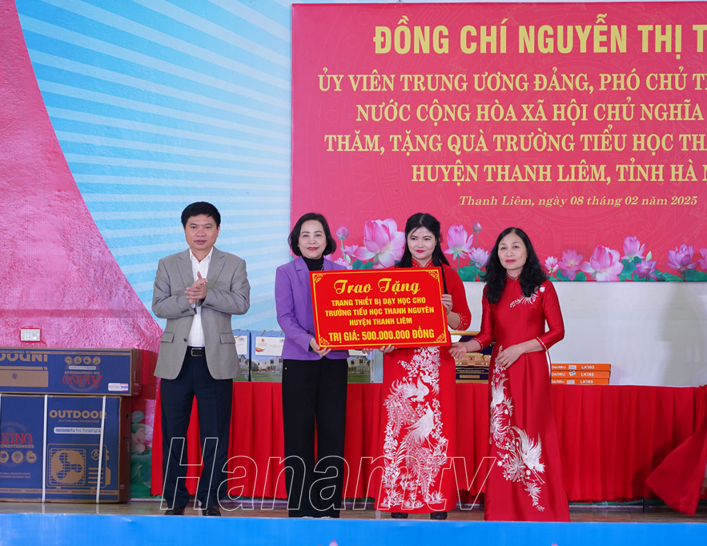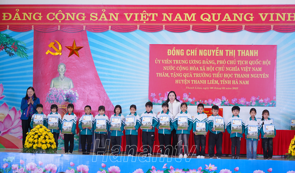 Trước đó, đồng chí Phó Chủ tịch Quốc hội Nguyễn Thị Thanh và Đoàn công tác đã tới thăm, tặng quà các học sinh Trường Tiểu học Thanh Nguyên, huyện Thanh Liêm. Tại đây, đồng chí Phó Chủ tịch Quốc hội đã trao tặng trang bị thiết bị, đồ dùng dạy học trị giá 500 triệu đồng cho nhà trường và tặng 50 suất quà cho học sinh có hoàn cảnh khó khăn vượt khó học tập.