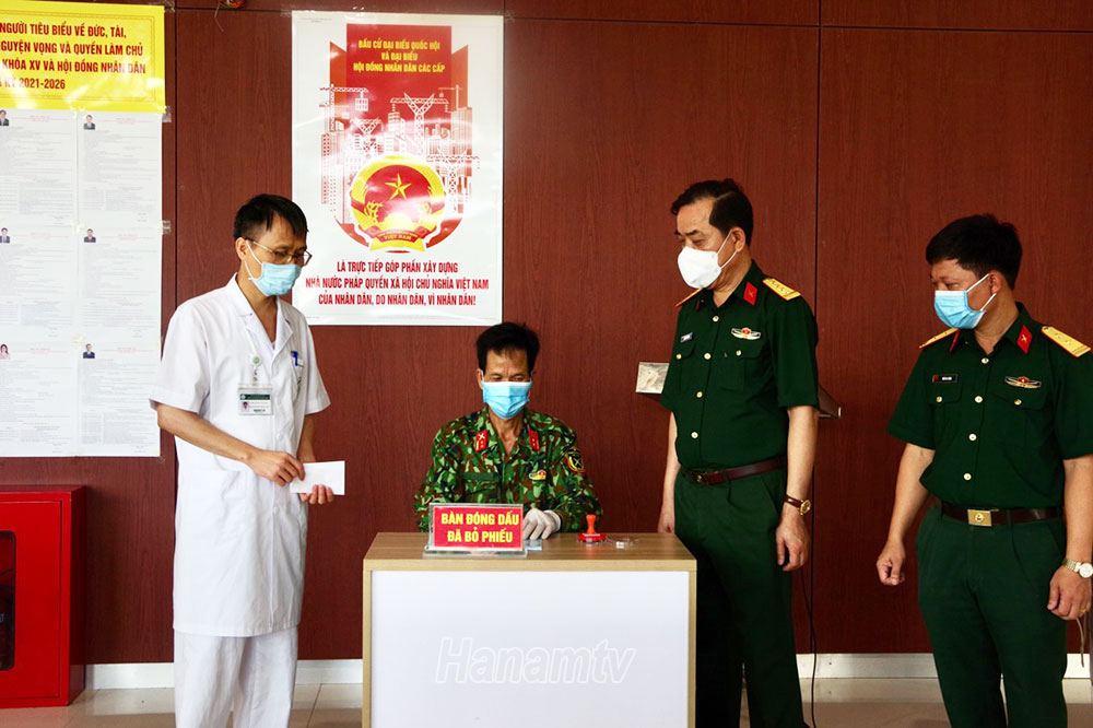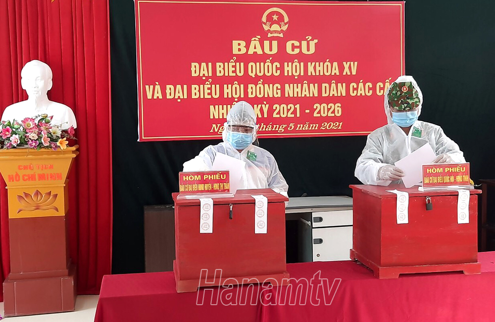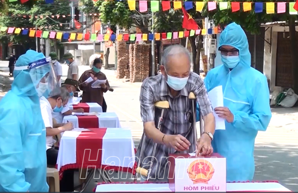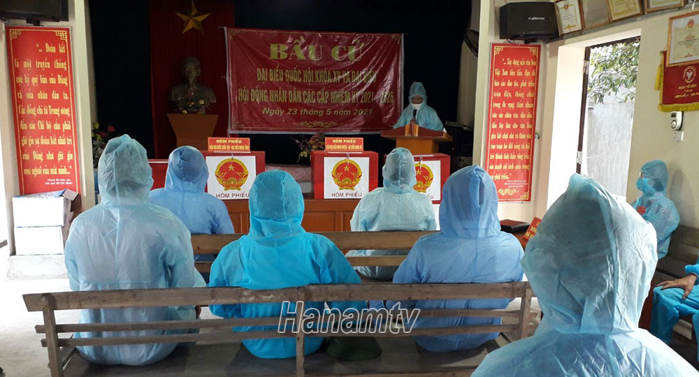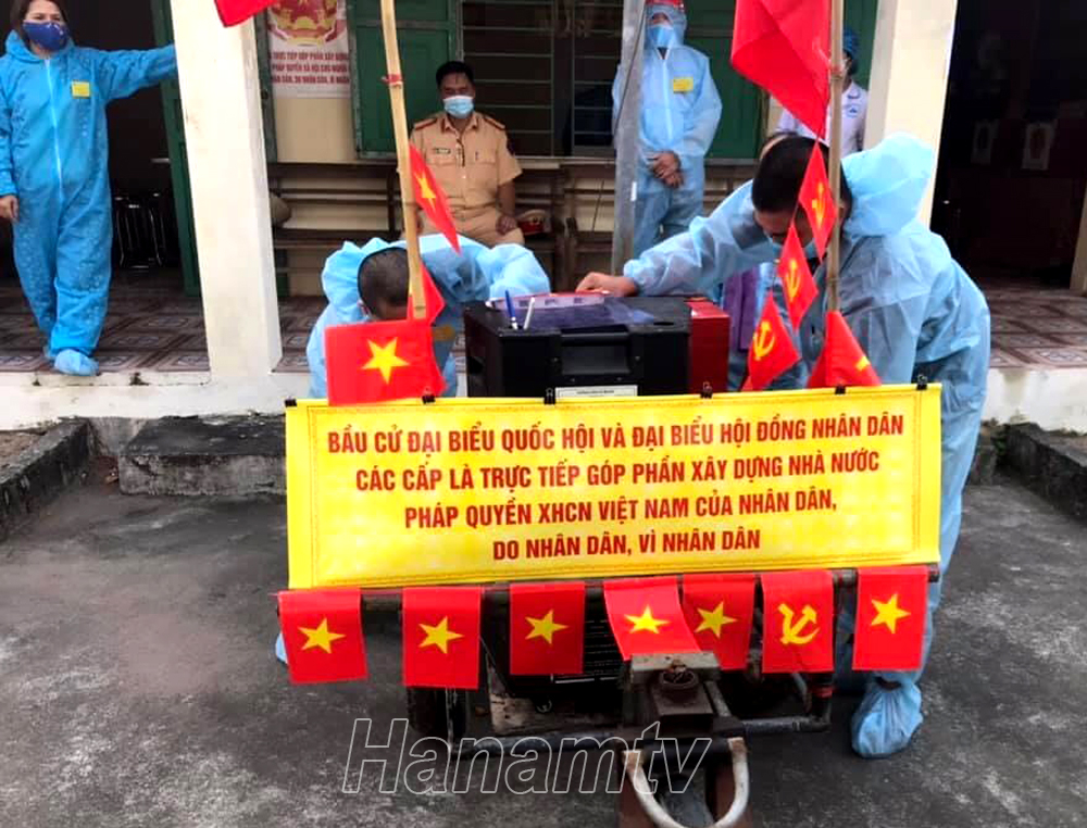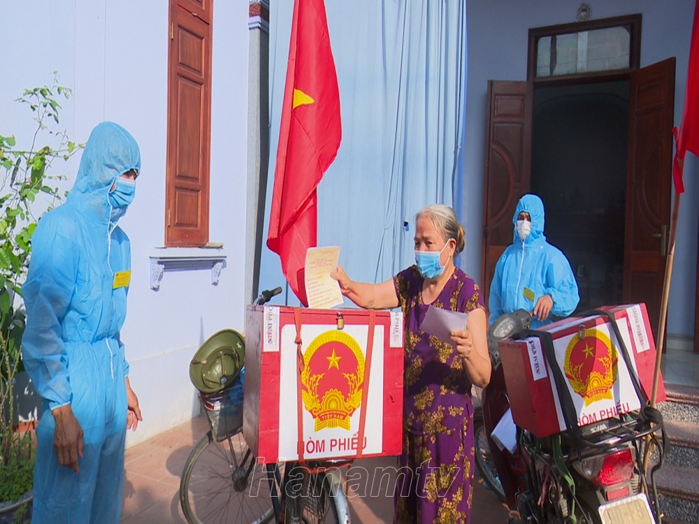 Công dân trong các khu cách ly tập trung của tỉnh bỏ phiếu bầu cử Ngoài các khu cách ly tập trung, Hà Nam còn có 11 thôn, tổ đang phong tỏa cách ly y tế để phòng chống dịch COVID-19 tại các xã Đạo Lý, Công Lý, Chân Lý, Bắc Lý của huyện Lý Nhân và Thị trấn Quế, xã Liên Sơn của huyện Kim Bảng với 2.404 hộ, 7.810 nhân khẩu. Do đó Hà Nam cũng chuẩn bị sẵn các kịch bản bầu cử khi phát hiện ca bệnh hoặc ca nghi nhiễm mới trong quá trình bầu cử. Để đảm bảo an toàn phòng chống dịch bệnh trong ngày bầu cử cũng như đảm bảo thời gian cho cử tri bỏ phiếu, các cụm dân cư đang phong tỏa cách ly tại đã tổ chức sử dụng hòm phiếu phụ đưa đến từng hộ gia đình để cử tri bỏ phiếu.