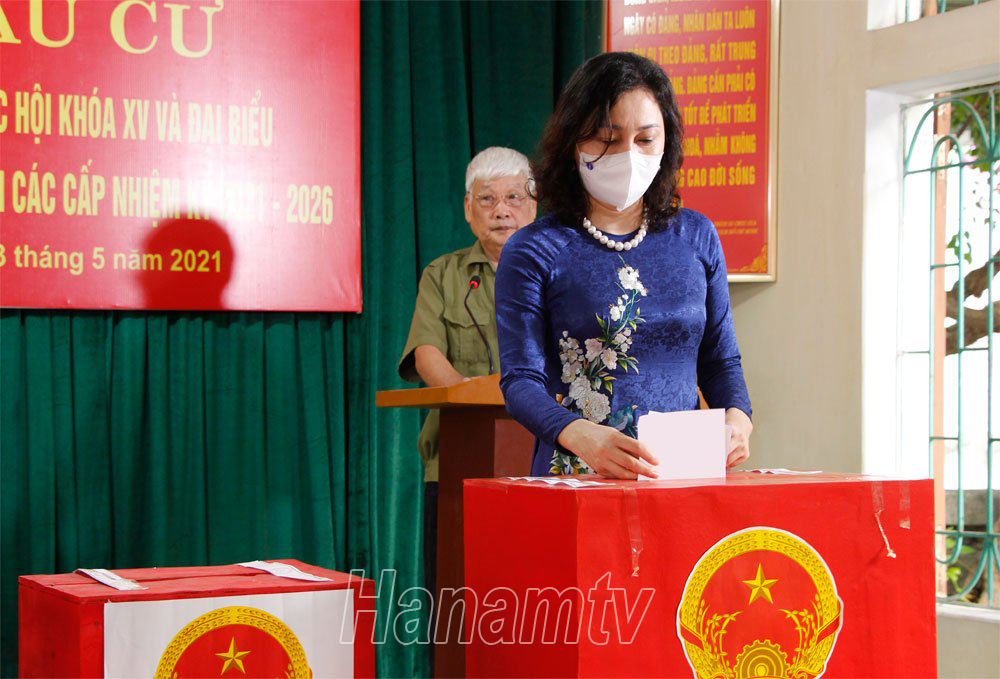 Đồng chí Lê Thị Thủy, Ủy viên Trung ương Đảng, Bí thư Tỉnh ủy, Trưởng đoàn đại biểu Quốc hội tỉnh, Trưởng ban Chỉ đạo bầu cử tỉnh tham gia bỏ phiếu bầu cử tại khu vục bỏ phiếu số 1, phường Quang Trung, TP.Phủ Lý.