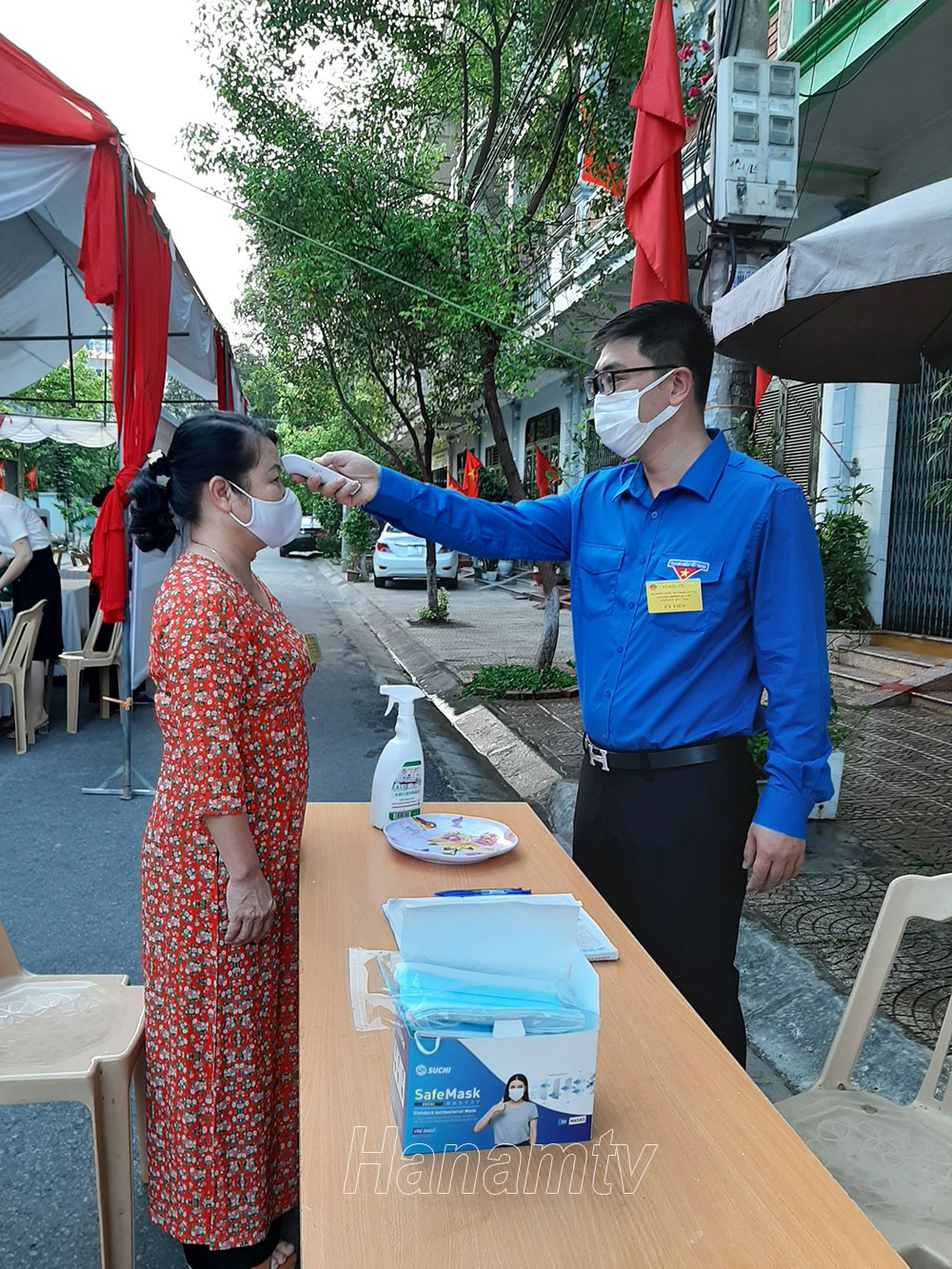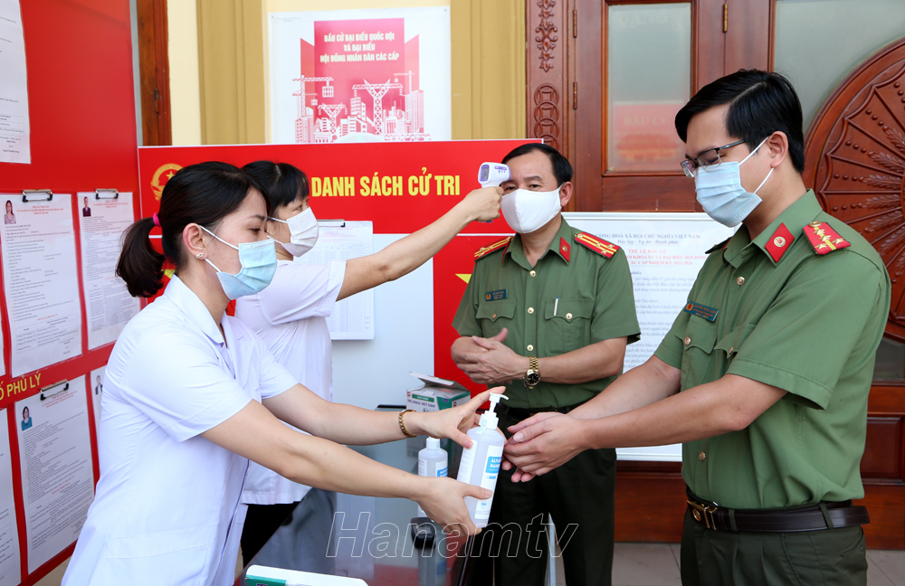 Công an Hà Nam đã bố trí lực lượng y tế tiến hành đo thân nhiệt, sát khuẩn và hướng dẫn cử tri bảo đảm khoảng cách phòng ngừa dịch bệnh khi tham gia bầu cử.