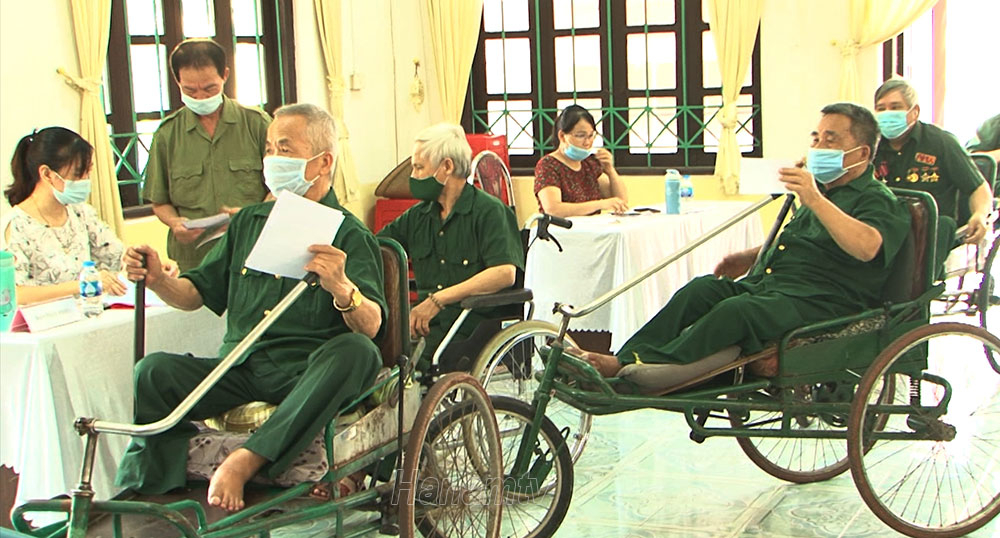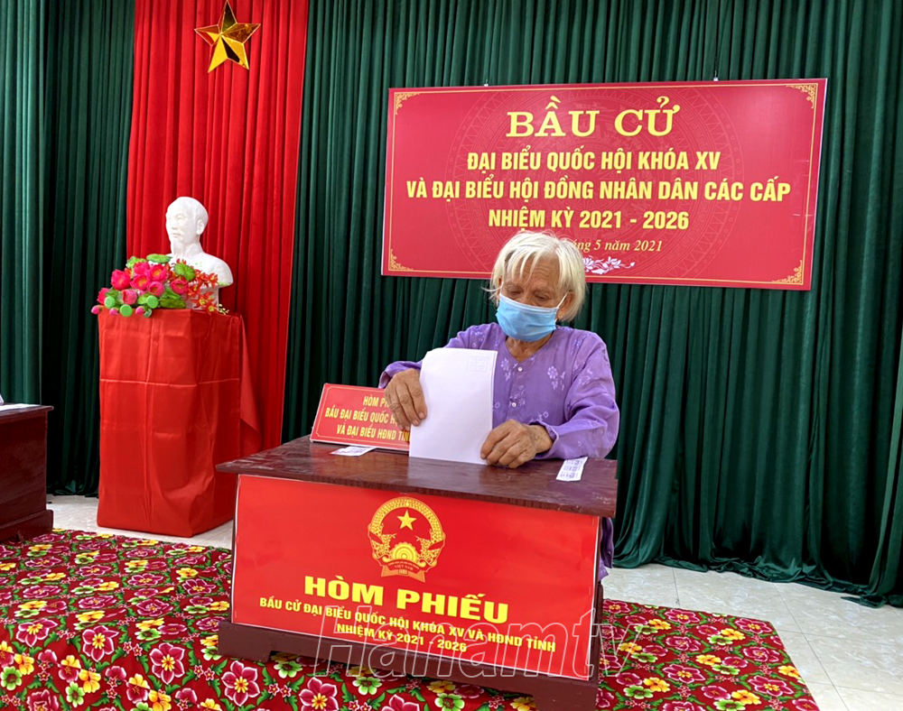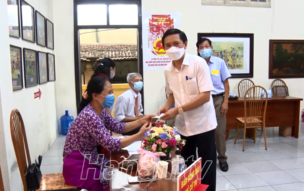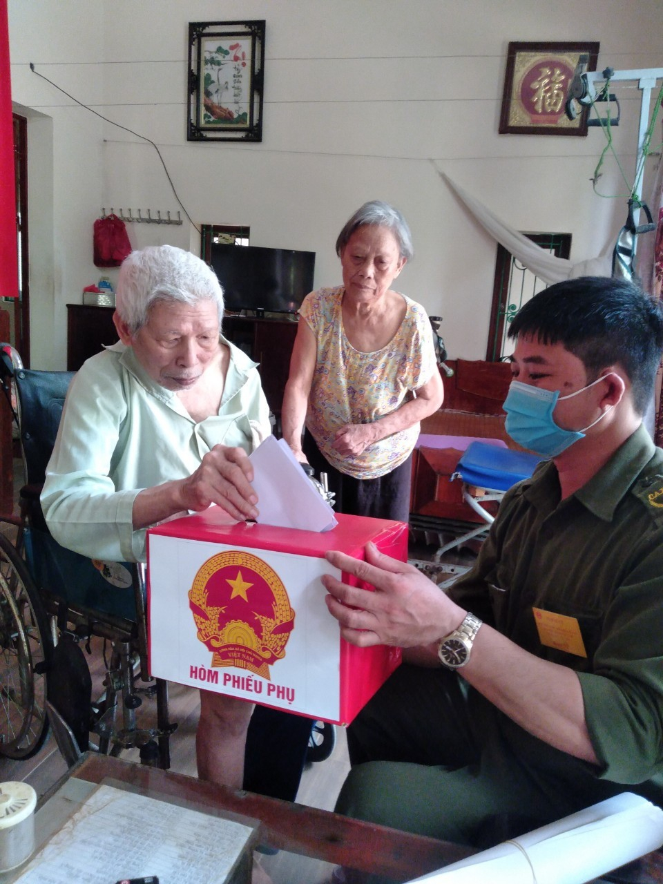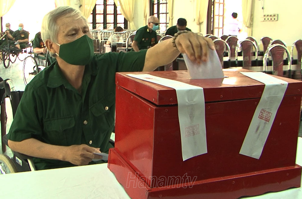 Không chỉ ở những địa bàn đang thực hiện giãn cách xã hội, phòng chống Covid-19, tại nhiều địa phương trong tỉnh, các tổ bầu cử cũng mang hòm phiếu phụ đến tận nhà để những cử tri cao tuổi, đi lại khó khăn thực hiện quyền công dân của mình Điểm bỏ phiếu Trung tâm thương binh Duy Tiên, một trong những điểm bỏ phiếu đặc thù bởi hầu hết cử tri là thương, bệnh binh nặng. Đi lại khó khăn, song các thương bệnh binh rất phấn khởi được thực hiện quyền công dân của mình.