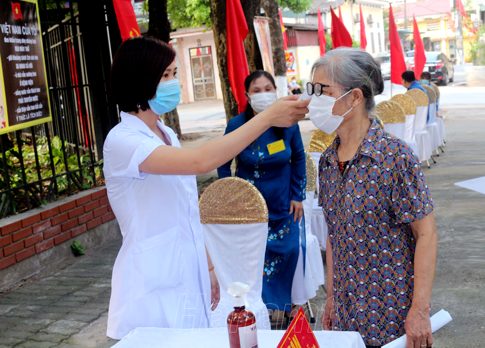 Cử tri tại điểm bầu cử số 3, phường Trần Hưng Đạo, TP Phủ Lý được kiểm tra thân nhiệt và thực hiện các biện pháp phòng, chống dịch khi đến bỏ phiếu