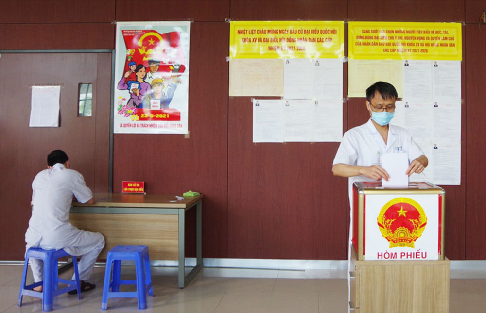 Các cán bộ, chiến sỹ Bộ CHQS tỉnh, Công an tỉnh, nhân viên y tế làm nhiệm vụ trong các khu cách ly tập trung Bệnh viện Bạch Mai cơ sở II thực hiện bầu cử ngay tại khu cách ly