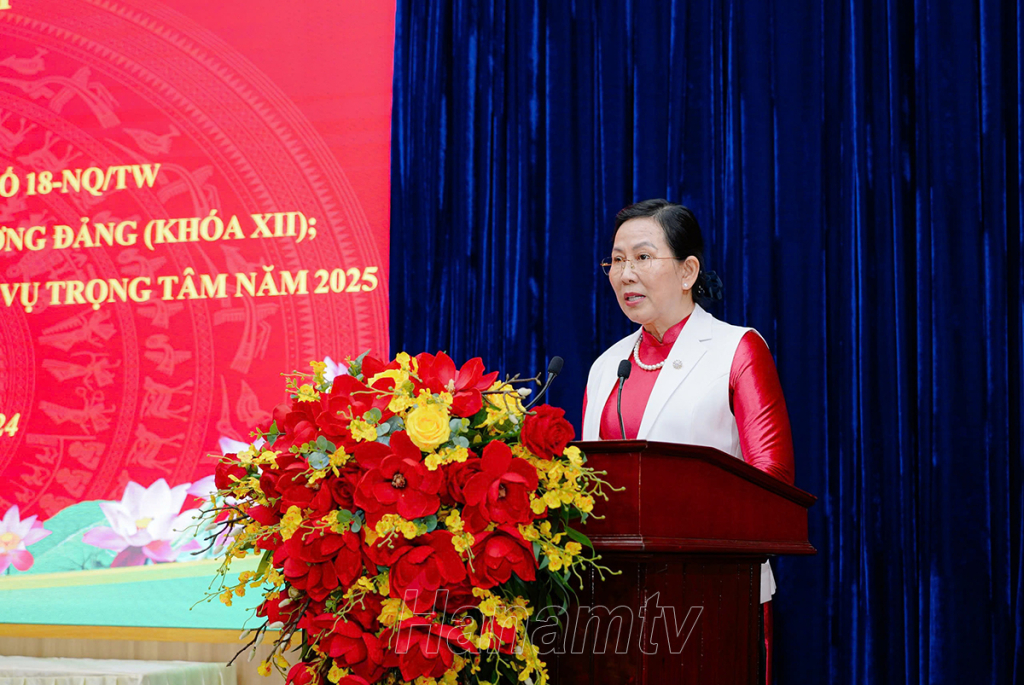 Đồng chí Đinh Thị Lụa, Phó Bí thư Thường trực Tỉnh ủy, Phó trưởng ban Thường trực Ban Chỉ đạo tỉnh về tổng kết thực hiện Nghị quyết 18-NQ/TU trình bày báo cáo của Tỉnh ủy tại hội nghị.