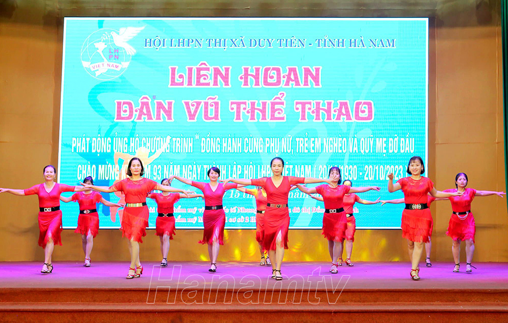 Nhân Kỷ niệm 93 năm ngày thành lập Hội LHPN Việt Nam (20/10/1930- 20/10/2023) Hội LHPN thị xã Duy Tiên đã tổ chức thành công liên hoan Dân vũ thể thao cấp thị xã với chủ đề “Vũ điệu khỏe – đẹp” lần thứ II. Liên hoan đã thu hút hàng trăm thí sinh đến từ 19 đội tham dự và đã đem đến hội thi các tiết mục đặc sắc. Mỗi đơn vị đều phát huy tính chủ động sáng tạo qua từng tiết mục, cho thấy sự chuẩn bị công phu,bài bản của các đội thi đối với tiết mục mình biểu diễn. Các động tác đều, đẹp, đúng nhạc, đảm bảo theo thể lệ của hội thi. Mỗi tiết mục biểu diễn đều lan toả niềm đam mê của các thành viên đối với bộ môn dân vũ thể thao, qua đó góp phần xây dựng đời sống văn hóa mới ở cơ sở nhất là trong phong trào xây dựng NTM nâng cao, NTM kiểu mẫu. Liên hoan không chỉ là sân chơi lành mạnh, bổ ích, góp phần tạo điều kiện cho cán bộ, hội viên, phụ nữ các địa phương, đơn vị được giao lưu, học tập kinh nghiệm lẫn nhau; tạo cầu nối gắn kết các thành viên, phát huy tinh thần đoàn kết, thể hiện tinh thần đồng đội và khả năng tự tin trong hoạt động tập thể, mà còn đánh dấu cho sự phát triển mạnh mẽ của các mô hình văn hóa văn nghệ, thể dục thể thao, là sự lựa chọn mới mẻ nhưng phù hợp với các đối tượng chị em phụ nữ ở mọi lứa tuổi.
