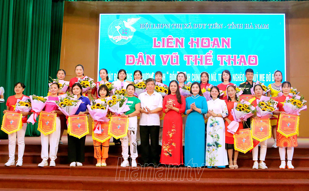 Lãnh đạo thị xã Duy Tiên, Lãnh đạo Hội LHPN tỉnh tặng hoa, cờ lưu niệm cho các đơn vị tham dự Liên hoan Dân vũ thể thao thị xã Duy Tiên