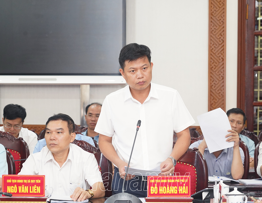 Chủ tịch UBND thành phố Phủ Lý phát biểu đóng góp ý kiến vào các dự thảo văn bản trình hội nghị.Chủ tịch UBND huyện Bình Lục phát biểu thảo luận tại hội nghị.
