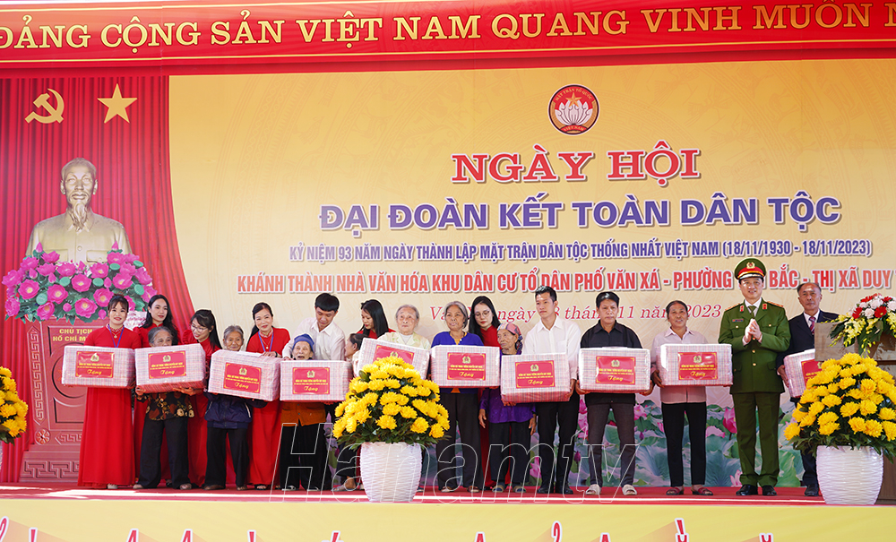 Trung tướng Nguyễn Duy Ngọc, Ủy viên Trung ương Đảng, Thứ trưởng Bộ Công an tặng hoa chúc mừng cán bộ và nhân dân Tổ dân phố Văn Xá, phường Yên Bắc, Thị xã Duy Tiên.Trung tướng Nguyễn Duy Ngọc tặng quà cho 10 hộ gia đình nghèo, có hoàn cảnh khó khăn của Tổ dân phố Văn Xá.