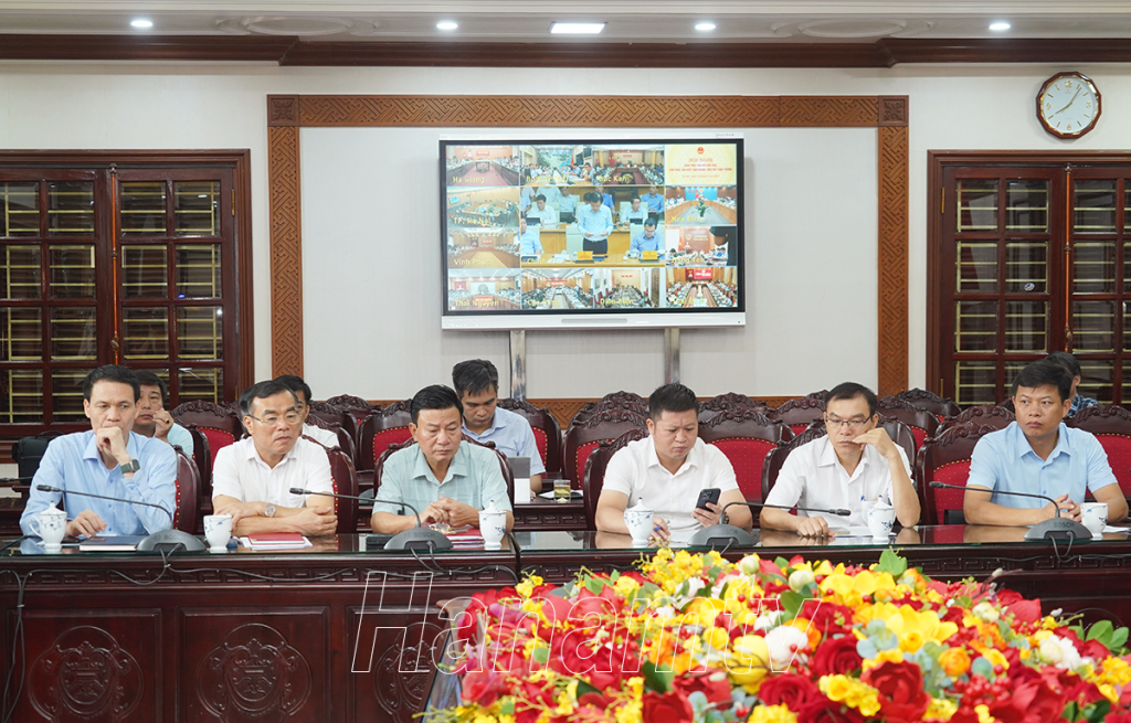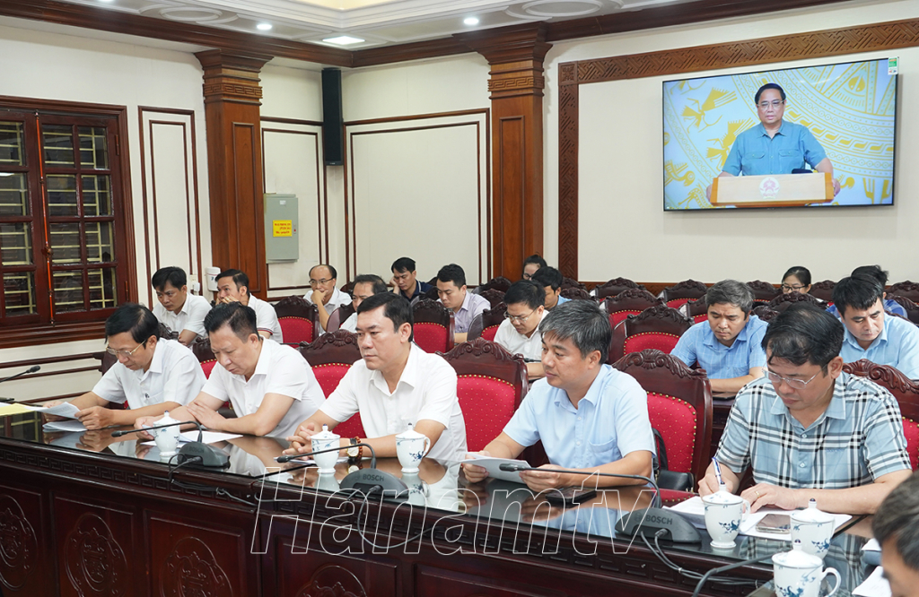 Các đồng chí Thường trực Tỉnh ủy và lãnh đạo UBND tỉnh, lãnh đạo các sở, ngành dự hội nghị tại điểm cầu Hà Nam.
