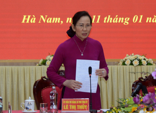 Đồng chí Lê Thị Thủy, Uỷ viên Trung Đảng, Bí thư Tỉnh uỷ phát biểu tại hội nghị Thay mặt Đảng bộ, chính quyền, nhân dân trong tỉnh, đồng chí Lê Thị Thủy, Ủy viên Trung ương Đảng, Bí thư Tỉnh ủy trân trọng cảm ơn và nghiêm túc tiếp thu những ý kiến chỉ đạo, gợi mở của Thủ tướng Chính phủ đối với tỉnh. Đồng chí khẳng định: trên cơ sở những ý kiến chỉ đạo, gợi mở của Thủ tướng Chính phủ thời gian tới tỉnh sẽ xây dựng kế hoạch, giải pháp trọng tâm để tổ chức thực hiện nghiêm túc, hiệu quả, đồng bộ từ tỉnh đến cơ sở. Đồng thời mong muốn, thời gian tới, Đảng bộ, chính quyền, nhân dân Hà Nam mong muốn tiếp tục nhận được sự quan tâm chỉ đạo và tạo điều kiện của Đảng, Chính phủ, Quốc hội đề tỉnh hoàn thành thắng lợi các mục tiêu đã đề ra.