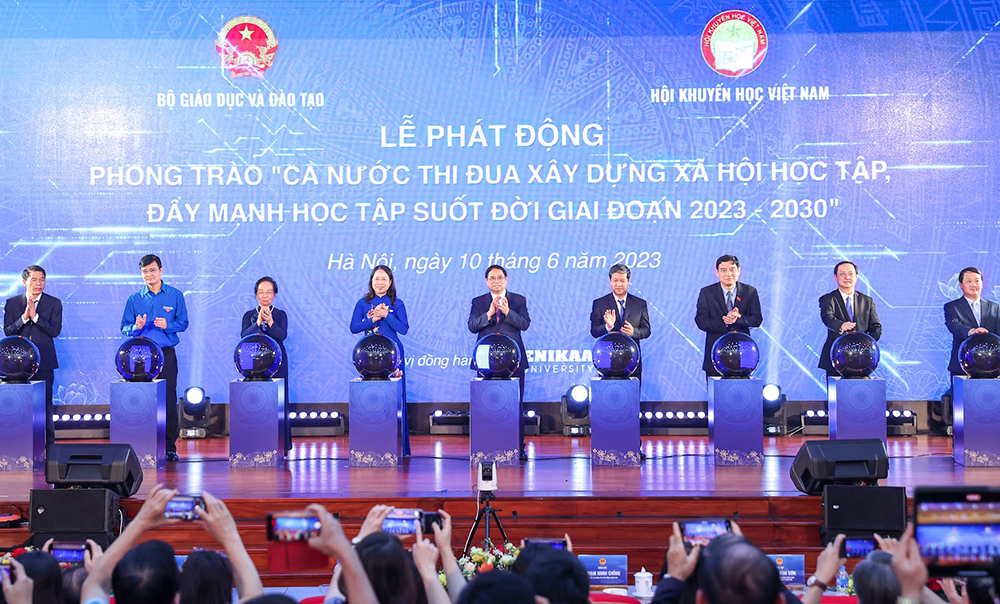 Sáng nay (10/6) tại Thủ tướng Chính phủ Phạm Minh Chính dự và phát động Phong trào thi đua “Cả nước thi đua xây dựng xã hội học tập (XHHT), đẩy mạnh học tập suốt đời giai đoạn 2023-2030”. Buổi lễ do Bộ Giáo dục và Đào tạo (GD&ĐT) chủ trì, phối hợp với Hội Khuyến học (HKH) Việt Nam và các cơ quan liên quan tổ chức tại Trường Đại học Phenikaa (Hà Nội),