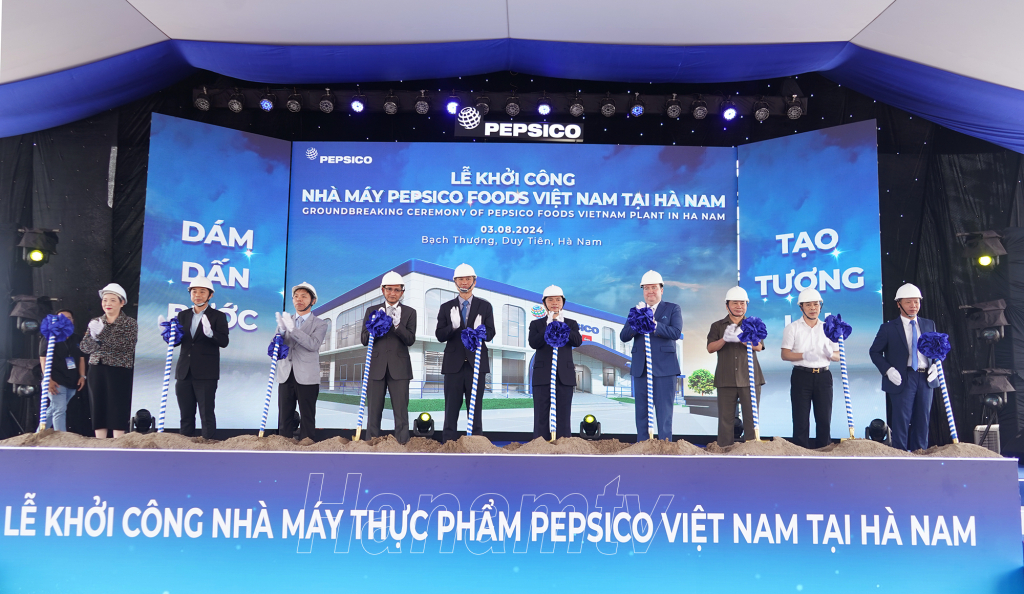 Đồng chí Chủ tịch UBND tỉnh Trương Quốc Huy và các đại biểu thực hiện nghi thức khởi công xây dựng Nhà máy PepsiCo Foods Việt Nam tại Hà Nam.