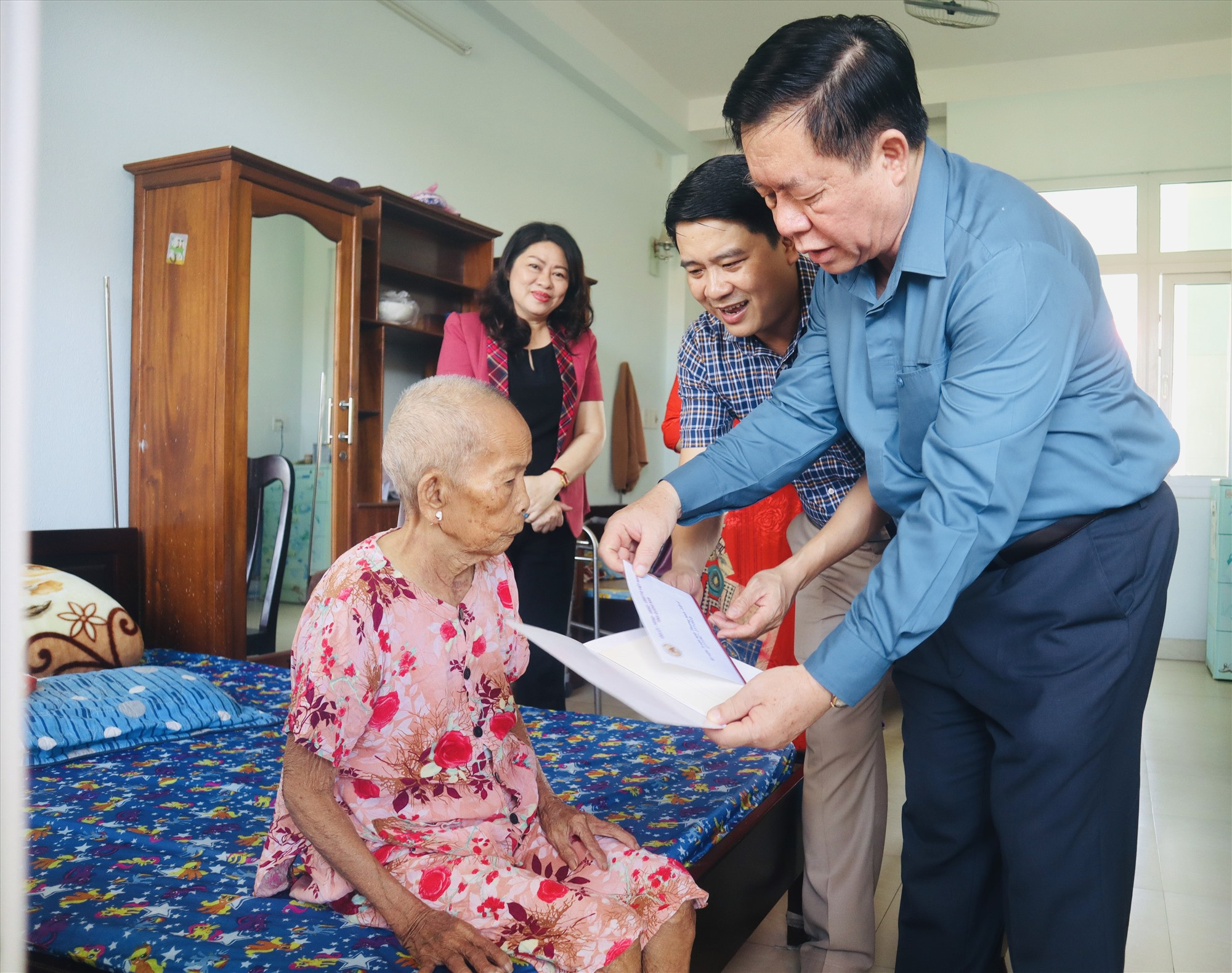 Trưởng Ban Tuyên giáo Trung ương Nguyễn Trọng Nghĩa và lãnh đạo tỉnh tặng quà cho người có công đang điều trị, chăm sóc tại trung tâm Nuôi dưỡng, điều dưỡng người có công Quảng Nam.