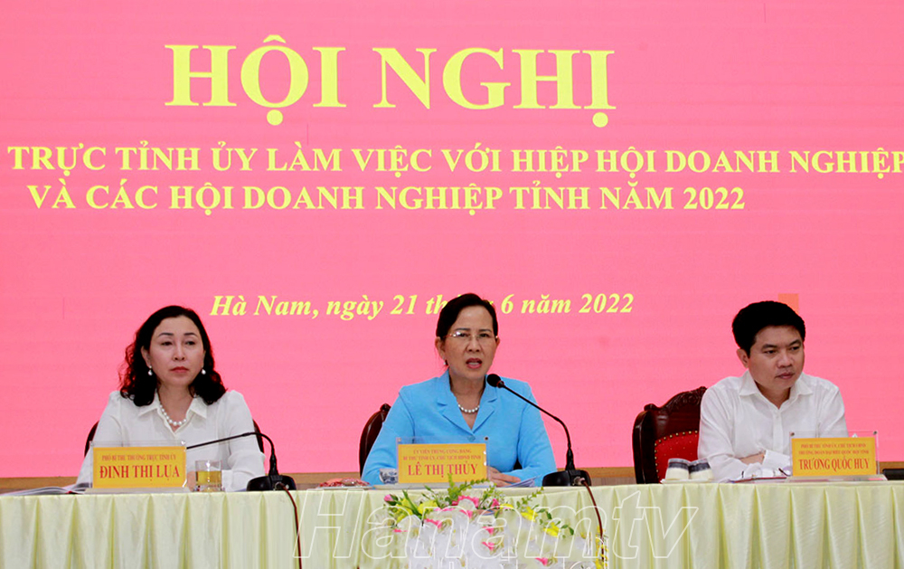 Phát biểu tại buổi làm việc, đồng chí Lê Thị Thủy - Ủy viên TW Đảng, Bí thư Tỉnh ủy, Chủ tịch HĐND tỉnh ghi nhận và đánh giá cao những ý kiến, kiến nghị của Hiệp hội DN, các Hội DN trong tỉnh. Khẳng định những đóng góp của cộng đồng DN, doanh nhân tỉnh Hà Nam đối với sự phát triển KT-XH của tỉnh trong thời gian qua là rất lớn, lãnh đạo tỉnh luôn trân trọng về những đóng góp đó.