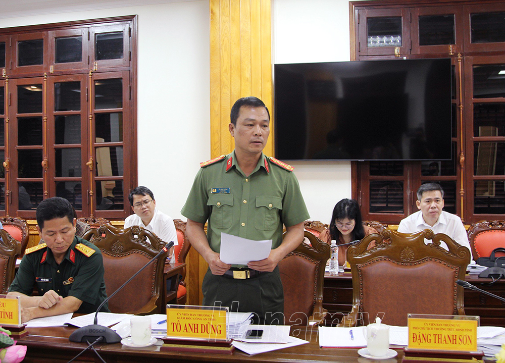 Đại tá Tô Anh Dũng, Ủy viên Ban Thường vụ Tỉnh ủy, Giám đốc Công an tỉnh phát biểu thảo luận tại hội nghị.