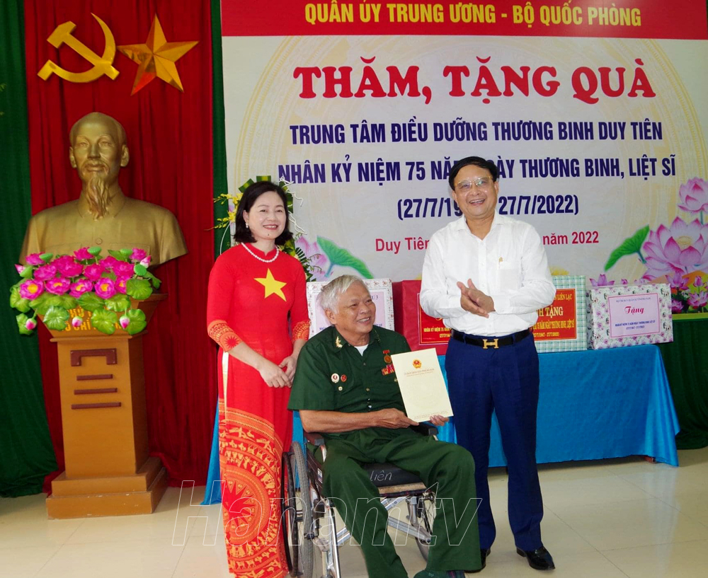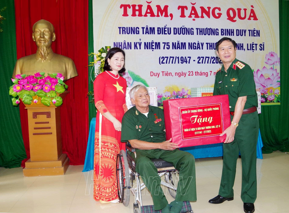 Thay mặt Quân ủy Trung ương, Bộ Quốc phòng, Thượng tướng Nguyễn Tân Cương đã trao quà của Bộ Quốc phòng tặng các thương, bệnh binh và Trung tâm Điều dưỡng thương binh Duy Tiên.