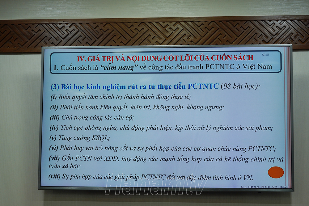 Về những điểm mới ấn tượng của cuốn sách, Phó Trưởng Ban Nội chính Trung ương nhấn mạnh, trước hết về hình thức, đây là cuốn sách bao gồm cả nội dung và hình ảnh. Cuốn sách có kết cấu logic, chặt chẽ, thể hiện sự kết hợp giữa “xây” và “chống”; giữa PCTN, tiêu cực với xây dựng, chỉnh đốn Đảng; giữa quyết tâm chính trị của người đứng đầu Đảng, của toàn Đảng và cả hệ thống chính trị với sự đồng thuận, ủng hộ của Nhân dân, bạn bè quốc tế.