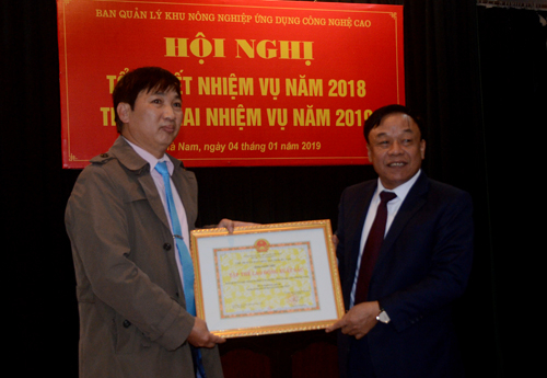 Đồng chí PCT UBND tỉnh trao bằng khen của UBND tỉnh cho tập thể Ban quản lý Khu nông nghiệp ứng dụng công nghệ cao