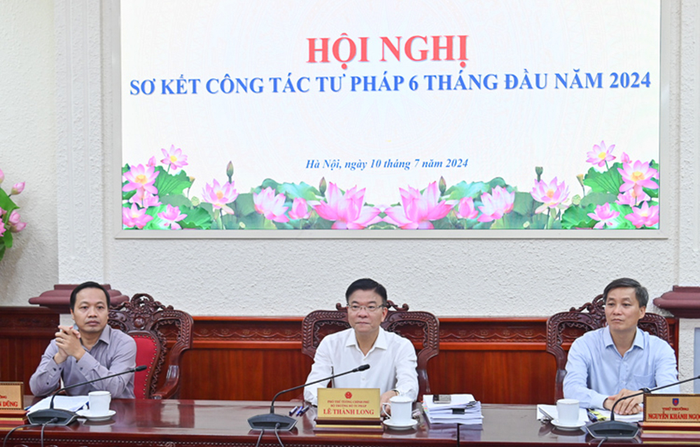 Sáng 10/7, Bộ Tư pháp tổ chức hội nghị sơ kết công tác tư pháp 6 tháng đầu năm, triển khai nhiệm vụ 6 tháng cuối năm 2024. Phó Thủ tướng Chính phủ, Bộ trưởng Bộ Tư pháp Lê Thành Long chủ trì hội nghị. Hội nghị được truyền trực tuyến tới 63 điểm cầu các tỉnh, thành phố trực thuộc Trung ương.