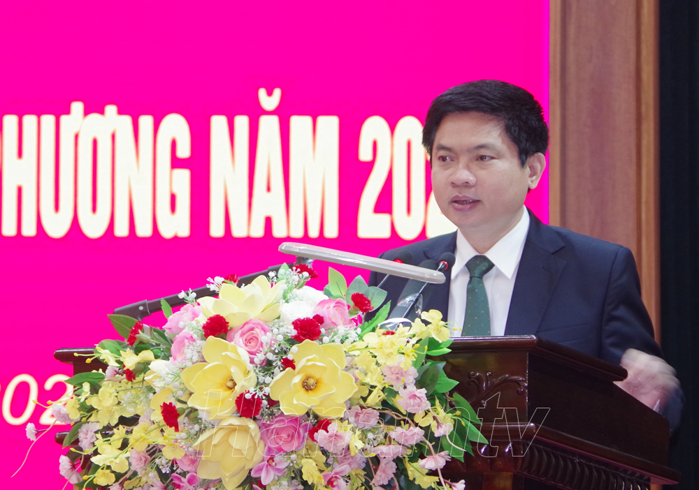 Đồng chí Trương Quốc Huy, Phó Bí thư Tỉnh ủy, Chủ tịch UBND tỉnh, Trưởng đoàn đại biểu Quốc hội tỉnh phát biểu tại hội nghị